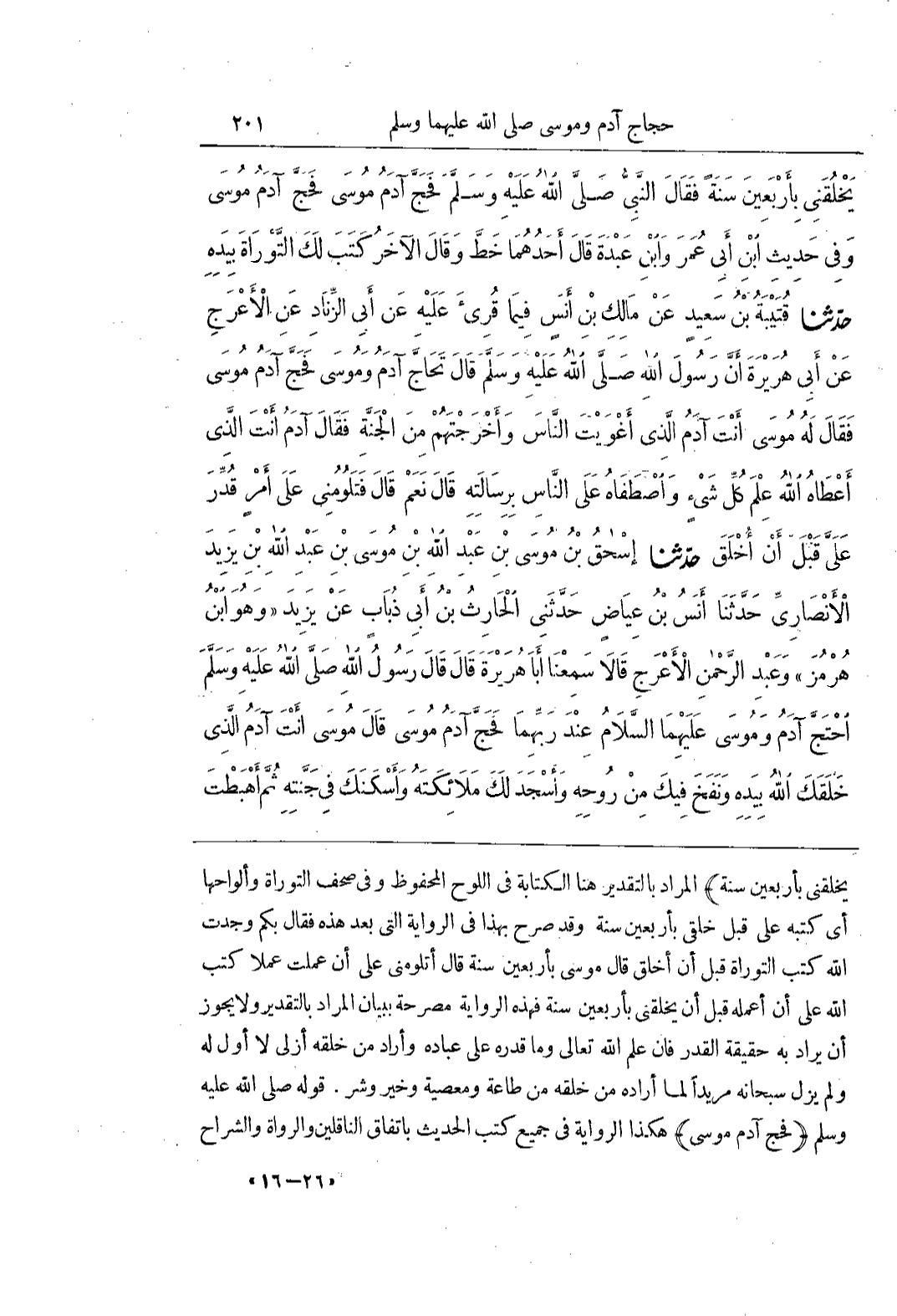 يَخْلُقَنِي بِأَرْبَعِينَ سَنَةً) الْمُرَادُ بِالتَّقْدِيرِ هُنَا الْكِتَابَةُ فِي اللَّوْحِ الْمَحْفُوظِ وَفِي صُحُفِ التَّوْرَاةِ وَأَلْوَاحِهَا أَيْ كَتَبَهُ عَلَيَّ قَبْلَ خَلْقِي بِأَرْبَعِينَ سَنَةً وَقَدْ صَرَّحَ بِهَذَا فِي الرِّوَايَةِ الَّتِي بَعْدَ هَذِهِ فَقَالَ بِكَمْ وَجَدْتَ اللَّهَ كَتَبَ التَّوْرَاةَ قَبْلَ أَنْ أُخْلَقَ قَالَ مُوسَى بِأَرْبَعِينَ سَنَةً قَالَ أَتَلُومُنِي عَلَى أَنْ عَمِلْتُ عَمَلًا كَتَبَ اللَّهُ عَلَيَّ أَنْ أَعْمَلُهُ قَبْلَ أَنْ يَخْلُقَنِي بِأَرْبَعِينَ سَنَةً فَهَذِهِ الرِّوَايَةُ مُصَرِّحَةٌ بِبَيَانِ الْمُرَادِ بِالتَّقْدِيرِ وَلَا يَجُوزُ أَنْ يُرَادَ بِهِ حَقِيقَةُ الْقَدَرِ فَإِنَّ عِلْمَ اللَّهِ تَعَالَى وَمَا قَدَّرَهُ عَلَى عِبَادِهِ وَأَرَادَ مِنْ خَلْقِهِ أَزَلِيٌّ لَا أَوَّلَ لَهُ وَلَمْ يَزَلْ سُبْحَانَهُ مُرِيدًا لِمَا أَرَادَهُ مِنْ خَلْقِهِ مِنْ طَاعَةٍ وَمَعْصِيَةٍ وَخَيْرٍ وَشَرٍّ قَوْلُهُ صَلَّى اللَّهُ عَلَيْهِ وَسَلَّمَ (فَحَجَّ آدَمُ مُوسَى) هَكَذَا الرِّوَايَةُ فِي جَمِيعِ كُتُبِ الْحَدِيثِ بِاتِّفَاقِ النَّاقِلِينَ وَالرُّوَاةِ وَالشُّرَّاحِ