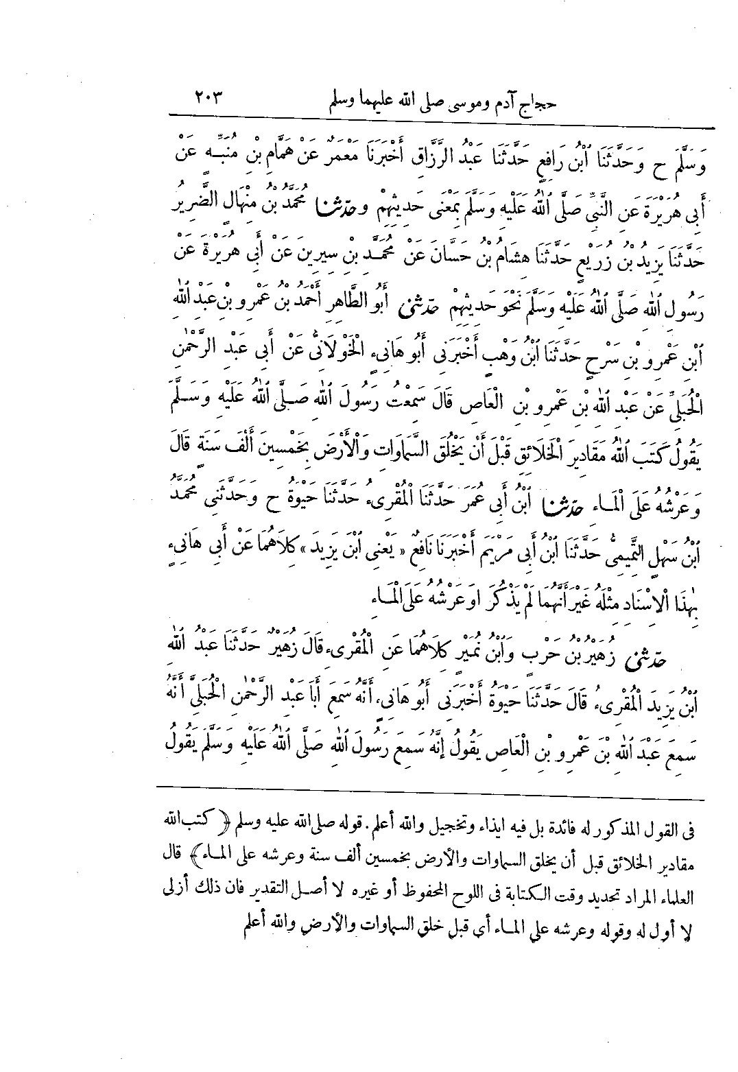 [2653] (كَتَبَ اللَّهُ مَقَادِيرَ الْخَلَائِقِ قَبْلَ أَنْ يَخْلُقَ السَّمَاوَاتِ وَالْأَرْضَ بِخَمْسِينَ أَلِفَ سَنَةٍ وَعَرْشُهُ عَلَى الْمَاءِ) قَالَ الْعُلَمَاءُ الْمُرَادُ تَحْدِيدُ وَقْتِ الْكِتَابَةِ فِي اللَّوْحِ الْمَحْفُوظِ أَوْ غَيْرِهِ لَا أَصْلُ التَّقْدِيرِ فَإِنَّ ذَلِكَ أَزَلِيٌّ لَا أَوَّلَ لَهُ وَقَوْلُهُ وَعَرْشُهُ عَلَى الْمَاءِ أَيْ قَبْلَ خَلْقِ السَّمَاوَاتِ وَالْأَرْضِ وَاَللَّهُ أَعْلَمُ