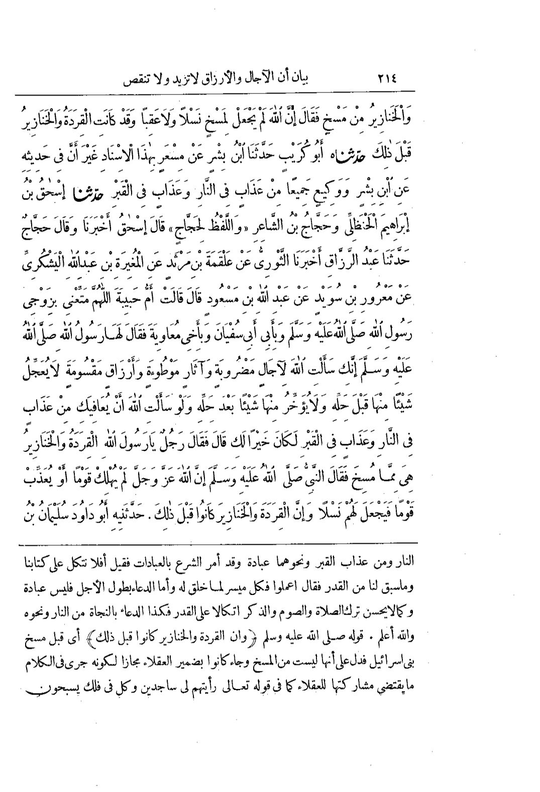 النَّارِ وَمِنْ عَذَابِ الْقَبْرِ وَنَحْوِهِمَا عِبَادَةٌ وَقَدْ أَمَرَ الشَّرْعُ بِالْعِبَادَاتِ فَقِيلَ أَفَلَا نَتَّكِلُ عَلَى كِتَابِنَا وَمَا سَبَقَ لَنَا مِنَ الْقَدَرِ فَقَالَ اعْمَلُوا فَكُلٌّ مُيَسَّرٌ لِمَا خُلِقَ لَهُ وَأَمَّا الدعاء بطول الأجل فليس عبادة وكمالا يَحْسُنُ تَرْكُ الصَّلَاةِ وَالصَّوْمِ وَالذِّكْرِ اتِّكَالًا عَلَى الْقَدَرِ فَكَذَا الدُّعَاءُ بِالنَّجَاةِ مِنَ النَّارِ وَنَحْوِهِ وَاللَّهُ أَعْلَمُ قَوْلُهُ صَلَّى اللَّهُ عَلَيْهِ وَسَلَّمَ (وَإِنَّ الْقِرَدَةَ وَالْخَنَازِيرَ كَانُوا قَبْلَ ذَلِكَ) أَيْ قَبْلَ مَسْخِ بَنِي إِسْرَائِيلَ فَدَلَّ عَلَى أَنَّهَا لَيْسَتْ مِنَ الْمَسْخِ وَجَاءَ كَانُوا بِضَمِيرِ الْعُقَلَاءِ مَجَازًا لِكَوْنِهِ جَرَى فِي الْكَلَامِ مَا يَقْتَضِي مُشَارَكَتَهَا لِلْعُقَلَاءِ كَمَا فِي قَوْلِهِ تَعَالَى رَأَيْتُهُمْ لي ساجدين وكل في فلك يسبحون