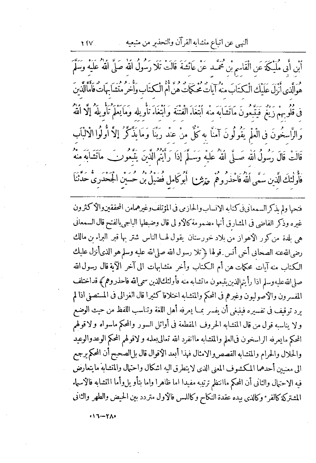 فَتْحُهَا وَلَمْ يَذْكُرِ السَّمْعَانِيُّ فِي كِتَابِهِ الْأَنْسَابِ وَالْحَازِمِيُّ فِي الْمُؤْتَلِفِ وَغَيْرُهُمَا مِنَ الْمُحَقِّقِينَ وَالْأَكْثَرُونَ غَيْرَهُ وَذَكَرَ الْقَاضِي فِي الْمَشَارِقِ أَنَّهَا مَضْمُومَةٌ كَالْأُولَى قَالَ وَضَبَطَهَا الْبَاجِيُّ بِالْفَتْحِ قَالَ السَّمْعَانِيُّ هِيَ بَلْدَةٌ مِنْ كُوَرِ الْأَهْوَازِ مِنْ بِلَادِ خُورِسْتَانَ يَقُولُ لَهَا النَّاسُ شَتَرُ بِهَا قَبْرُ الْبَرَاءِ بْنِ مَالِكٍ رَضِيَ اللَّهُ عَنْهُ الصَّحَابِيِّ أَخِي أَنَسٍ قَوْلُهَا (تَلَا رَسُولِ اللَّهِ صَلَّى اللَّهُ عَلَيْهِ وَسَلَّمَ هُوَ الَّذِي أَنْزَلَ عَلَيْكَ الْكِتَابَ مِنْهُ آيَاتٌ مُحْكَمَاتٌ هُنَّ أُمُّ الْكِتَابِ وأخر متشابهات إِلَى آخِرِ الْآيَةِ قَالَ رَسُولُ اللَّهِ صَلَّى اللَّهُ عَلَيْهِ وَسَلَّمَ إِذَا رَأَيْتُمُ الَّذِينَ يَتَّبِعُونَ مَا تَشَابَهَ مِنْهُ فَأُولَئِكَ الَّذِينَ سَمَّى اللَّهُ فَاحْذَرُوهُمْ) قَدِ اخْتَلَفَ الْمُفَسِّرُونَ وَالْأُصُولِيُّونَ وَغَيْرُهُمْ فِي الْمُحْكَمِ وَالْمُتَشَابِهِ اخْتِلَافًا كَثِيرًا قَالَ الْغَزَالِيُّ فِي الْمُسْتَصْفَى إِذَا لَمْ يَرِدْ تَوْقِيفٌ فِي تَفْسِيرِهِ فَيَنْبَغِي أَنْ يُفَسَّرَ بِمَا يَعْرِفُهُ أَهْلُ اللُّغَةِ وَتَنَاسُبُ اللَّفْظُ مِنْ حَيْثُ الْوَضْعِ وَلَا يُنَاسِبُهُ قَوْلُ مَنْ قَالَ الْمُتَشَابِهُ الْحُرُوفُ الْمُقَطَّعَةُ فِي أَوَائِلِ السُّوَرِ وَالْمُحْكَمُ مَا سِوَاهُ وَلَا قَوْلُهُمْ الْمُحْكَمُ مَا يَعْرِفُهُ الرَّاسِخُونَ فِي الْعِلْمِ وَالْمُتَشَابِهُ مَا انْفَرَدَ اللَّهُ تَعَالَى بِعِلْمِهِ وَلَا قَوْلُهُمْ الْمُحْكَمُ الْوَعْدُ وَالْوَعِيدُ وَالْحَلَالُ وَالْحَرَامُ وَالْمُتَشَابِهُ الْقَصَصُ وَالْأَمْثَالُ فَهَذَا أَبْعَدُ الْأَقْوَالِ قَالَ بَلِ الصَّحِيحُ أَنَّ الْمُحْكَمَ يَرْجِعُ إِلَى مَعْنَيَيْنِ أَحَدُهُمَا الْمَكْشُوفُ الْمَعْنَى الَّذِي لَا يَتَطَرَّقُ إِلَيْهِ إِشْكَالٌ وَاحْتِمَالٌ وَالْمُتَشَابِهُ مَا يَتَعَارَضُ فِيهِ الِاحْتِمَالِ وَالثَّانِي أَنَّ الْمُحْكَمَ مَا انْتَظَمَ تَرْتِيبُهُ مُفِيدًا إِمَّا ظَاهِرًا وَإِمَّا بِتَأْوِيلٍ وَأَمَّا الْمُتَشَابِهِ فَالْأَسْمَاءُ الْمُشْتَرَكَةُ كَاَلْقُرْءِ وكالذي بيده عقدة النكاح وكاللمس فَالْأَوَّلُ مُتَرَدِّدٌ بَيْنَ الْحَيْضِ وَالطُّهْرِ وَالثَّانِي