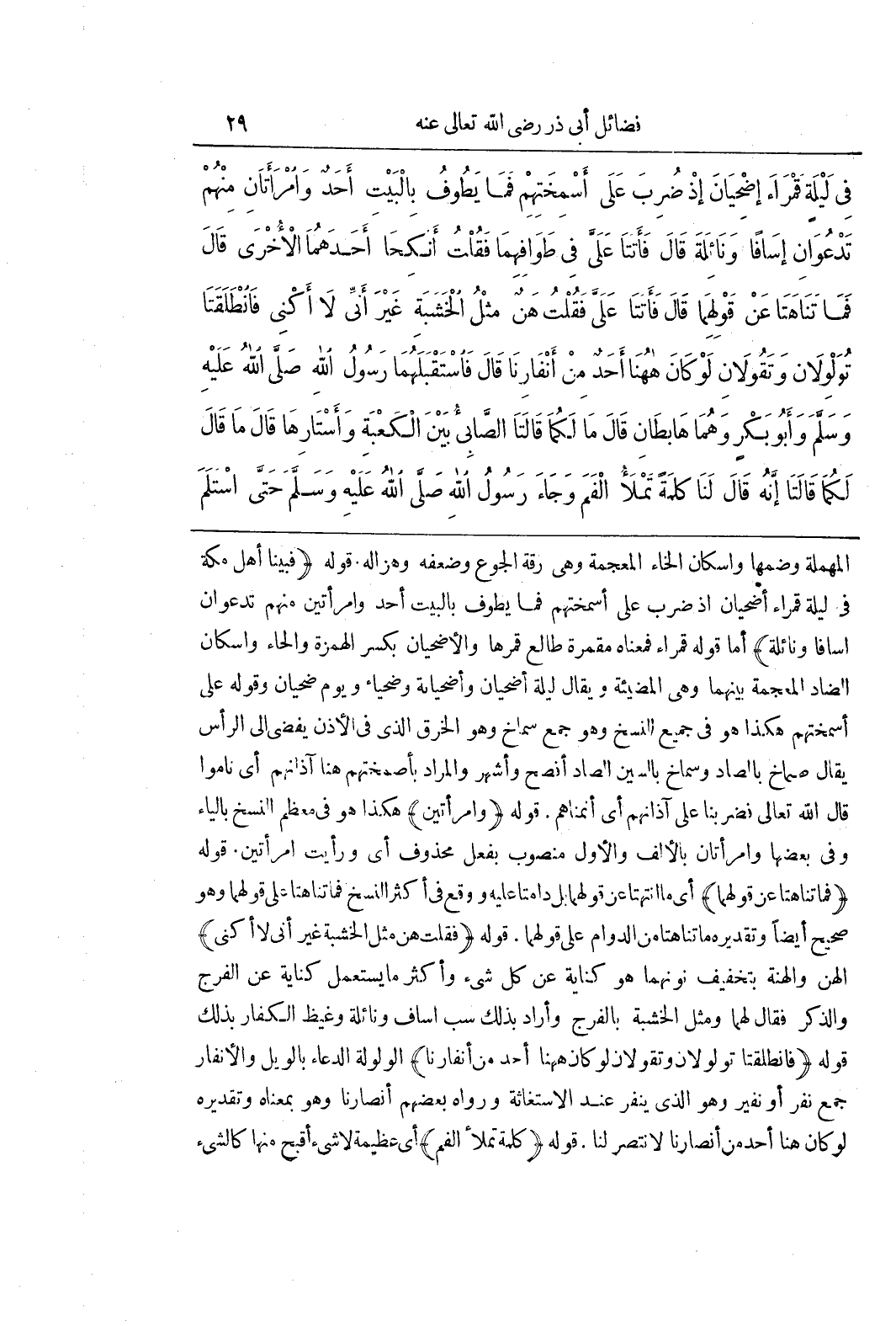 الْمُهْمَلَةِ وَضَمِّهَا وَإِسْكَانِ الْخَاءِ الْمُعْجَمَةِ وَهِيَ رِقَّةُ الْجُوعِ وَضَعْفِهِ وَهُزَالِهِ قَوْلُهُ (فَبَيْنَا أَهْلُ مَكَّةَ فِي لَيْلَةٍ قَمْرَاءَ إِضْحِيَانٍ إِذْ ضُرِبَ عَلَى أَسْمِخَتِهِمْ فَمَا يَطُوفُ بِالْبَيْتِ أَحَدٌ وَامْرَأَتَيْنِ مِنْهُمْ تَدْعُوَانِ إِسَافًا وَنَائِلَةَ) أَمَّا قَوْلُهُ قَمْرَاءَ فَمَعْنَاهُ مُقْمِرَةٌ طَالِعٌ قَمَرُهَا وَالْإِضْحِيَانُ بِكَسْرِ الْهَمْزَةِ وَالْحَاءِ وَإِسْكَانِ الضَّادِ الْمُعْجَمَةِ بَيْنَهُمَا وَهِيَ الْمُضِيئَةُ وَيُقَالُ ليلة أضحيان وإضحياته وَضَحْيَاءُ وَيَوْمٌ ضَحْيَانُ وَقَوْلُهُ عَلَى أَسْمِخَتِهِمْ هَكَذَا هو في جميع النسخ وهو جمع سماخ وَهُوَ الْخَرْقُ الَّذِي فِي الْأُذُنِ يُفْضِي إِلَى الرَّأْسِ يُقَالُ صِمَاخٌ بِالصَّادِ وَسِمَاخٌ بِالسِّينِ الصَّادِ أَفْصَحُ وَأَشْهَرُ وَالْمُرَادُ بِأَصْمِخَتِهِمْ هُنَا آذَانُهُمْ أَيْ نَامُوا قَالَ اللَّهُ تَعَالَى فَضَرَبْنَا عَلَى آذَانِهِمْ أَيْ أَنَمْنَاهُمْ قَوْلُهُ (وَامْرَأَتَيْنِ) هَكَذَا هُوَ فِي مُعْظَمِ النُّسَخِ بِالْيَاءِ وَفِي بَعْضِهَا وَامْرَأَتَانِ بِالْأَلِفِ وَالْأَوَّلُ مَنْصُوبٌ بِفِعْلٍ مَحْذُوفٍ أَيْ وَرَأَيْتُ امْرَأَتَيْنِ قَوْلُهُ (فَمَا تَنَاهَتَا عَنْ قَوْلِهِمَا) أَيْ مَا انتهتا عَنْ قَوْلِهِمَا بَلْ دَامَتَا عَلَيْهِ وَوَقَعَ فِي أَكْثَرِ النُّسَخِ فَمَا تَنَاهَتَا عَلَى قَوْلِهِمَا وَهُوَ صَحِيحٌ أَيْضًا وَتَقْدِيرُهُ مَا تَنَاهَتَا مِنَ الدَّوَامِ عَلَى قَوْلِهِمَا قَوْلُهُ (فَقُلْتُ هَنٌ مِثْلُ الْخَشَبَةِ غَيْرَ أَنِّي لَا أَكْنِي) الْهَنُ وَالْهَنَةُ بِتَخْفِيفِ نونهما هو كناية عن كل شئ وَأَكْثَرُ مَا يُسْتَعْمَلُ كِنَايَةً عَنِ الْفَرْجِ وَالذَّكَرِ فَقَالَ لَهُمَا وَمَثَّلَ الْخَشَبَةَ بِالْفَرْجِ وَأَرَادَ بِذَلِكَ سَبَّ إِسَافَ وَنَائِلَةَ وَغَيْظَ الْكُفَّارِ بِذَلِكَ قَوْلُهُ (فانطلقتا تولولان وتقولان لو كان ها هنا أَحَدٌ مِنْ أَنْفَارِنَا) الْوَلْوَلَةُ الدُّعَاءُ بِالْوَيْلِ وَالْأَنْفَارُ جمع نفر أو نفير وهوالذي يَنْفِرُ عِنْدَ الِاسْتِغَاثَةِ وَرَوَاهُ بَعْضُهُمْ أَنْصَارُنَا وَهُوَ بِمَعْنَاهُ وَتَقْدِيرُهُ لَوْ كَانَ هُنَا أَحَدٌ مِنْ أَنْصَارِنَا لَانْتَصَرَ لَنَا قَوْلُهُ (كَلِمَةٌ تَمْلَأُ الْفَمَ) أي عظيمة لا شئ أقبح منها كالشئ