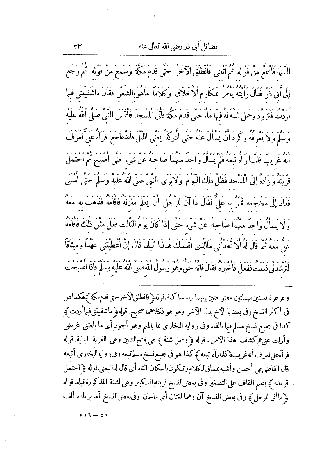 وَعَرْعَرَةُ بِعَيْنَيْنِ مُهْمَلَتَيْنِ مَفْتُوحَتَيْنِ بَيْنَهُمَا رَاءٌ سَاكِنَةٌ قَوْلُهُ (فَانْطَلَقَ الْآخَرُ حَتَّى قَدِمَ مَكَّةَ) هَكَذَا هُوَ فِي أَكْثَرِ النُّسَخِ وَفِي بَعْضِهَا الْأَخُ بَدَلَ الْآخَرِ وَهُوَ هُوَ فَكِلَاهُمَا صَحِيحٌ قَوْلُهُ (مَا شَفَيْتنِي فِيمَا أَرَدْتُ) كَذَا فِي جَمِيعِ نُسَخِ مُسْلِمٍ فِيمَا بِالْفَاءِ وَفِي رِوَايَةِ الْبُخَارِيِّ مِمَّا بِالْمِيمِ وَهُوَ أَجْوَدُ أَيْ مَا بَلَّغْتنِي غَرَضِي وَأَزَلْتُ عَنِّي هَمَّ كَشْفِ هَذَا الْأَمْرِ قَوْلُهُ (وَحَمَلَ شَنَّةً) هِيَ بِفَتْحِ الشِّينِ وَهِيَ الْقِرْبَةُ الْبَالِيَةُ قَوْلُهُ فَرَآهُ عَلِيٌّ فَعَرَفَ أَنَّهُ غَرِيبٌ (فَلَمَّا رَآهُ تَبِعَهُ) كَذَا هُوَ فِي جَمِيعِ نُسَخِ مُسْلِمٍ تَبِعَهُ وَفِي رِوَايَةِ الْبُخَارِيِّ أَتْبَعُهُ قَالَ الْقَاضِي هِيَ أَحْسَنُ وَأَشْبَهُ بِمَسَاقِ الْكَلَامِ وَتَكُونُ بِإِسْكَانِ التَّاءِ أَيْ قَالَ لَهُ اتْبَعْنِي قَوْلُهُ (احْتَمَلَ قُرَيْبَتَهُ) بِضَمِّ الْقَافِ عَلَى التَّصْغِيرِ وَفِي بَعْضِ النُّسَخِ قِرْبَتَهُ بِالتَّكْبِيرِ وَهِيَ الشنة المذكورة قبله قوله (ماأني لِلرَّجُلِ) وَفِي بَعْضِ النُّسَخِ آنَ وَهُمَا لُغَتَانِ أَيْ مَا حَانَ وَفِي بَعْضِ النُّسَخِ أَمَا بزيادة ألف