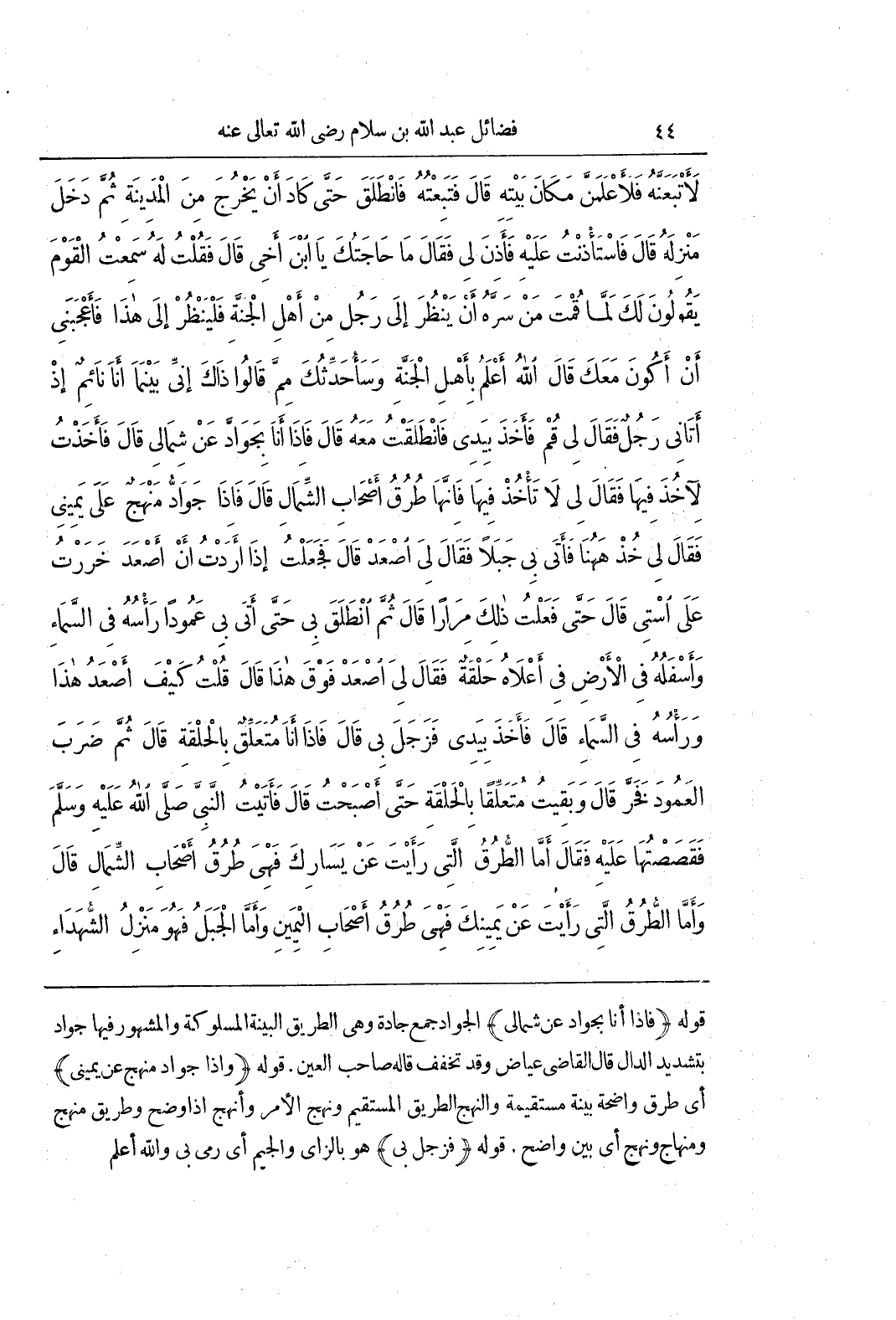 قَوْلُهُ (فَإِذَا أَنَا بِجَوَادٍ عَنْ شِمَالِي) الْجَوَادُ جَمْعُ جَادَّةٌ وَهِيَ الطَّرِيقُ الْبَيِّنَةُ الْمَسْلُوكَةُ وَالْمَشْهُورُ فِيهَا جَوَادٌّ بِتَشْدِيدِ الدَّالِ قَالَ الْقَاضِي عِيَاضٌ وَقَدْ تُخَفَّفُ قَالَهُ صَاحِبُ الْعَيْنِ قَوْلُهُ (وَإِذَا جَوَادٌ مَنْهَجٌ عَنْ يَمِينِي) أَيْ طُرُقٌ وَاضِحَةٌ بَيِّنَةٌ مُسْتَقِيمَةٌ وَالنَّهْجُ الطَّرِيقُ الْمُسْتَقِيمُ وَنَهَجَ الْأَمْرَ وَأَنْهَجَ إِذَا وَضَحَ وَطَرِيقٌ مَنْهَجٌ وَمِنْهَاجُ وَنَهِجُ أَيْ بَيِّنٌ وَاضِحٌ قَوْلُهُ (فَزَجَلَ بِي) هُوَ بِالزَّايِ وَالْجِيمِ أَيْ رَمَى بِي وَاللَّهُ أَعْلَمُ