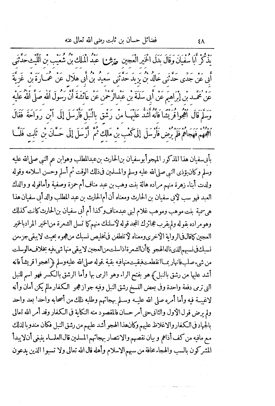 [2490] (اهْجُوَا قُرَيْشًا فَإِنَّهُ أَشَدُّ عَلَيْهَا مِنْ رَشْقٍ بِالنَّبْلِ) هُوَ بِفَتْحِ الرَّاءِ وَهُوَ الرَّمْيُ بِهَا وَأَمَّا الرِّشْقُ بِالْكَسْرِ فَهُوَ اسْمٌ لِلنَّبْلِ الَّتِي تُرْمَى دَفْعَةً وَاحِدَةً وَفِي بَعْضِ النُّسَخِ رَشْقِ النَّبْلِ وَفِيهِ جَوَازُ هَجْوِ الكفار مالم يَكُنْ أَمَانٌ وَأَنَّهُ لَا غِيبَةَ فِيهِ وَأَمَّا أَمْرُهُ صَلَّى اللَّهُ عَلَيْهِ وَسَلَّمَ بِهِجَائِهِمْ وَطَلَبُهُ ذَلِكَ مِنْ أَصْحَابِهِ وَاحِدًا بَعْدَ وَاحِدٍ وَلَمْ يَرْضَ قَوْلَ الْأَوَّلِ وَالثَّانِي حَتَّى أَمَرَ حَسَّانَ فَالْمَقْصُودُ مِنْهُ النِّكَايَةُ فِي الْكُفَّارِ وَقَدْ أَمَرَ اللَّهُ تَعَالَى بِالْجِهَادِ فِي الْكُفَّارِ وَالْإِغْلَاظِ عَلَيْهِمْ وَكَانَ هَذَا الْهَجْوُ أَشَدَّ عَلَيْهِمْ مِنْ رَشْقِ النَّبْلِ فَكَانَ مَنْدُوبًا لِذَلِكَ مَعَ مَا فِيهِ مِنْ كَفِّ أَذَاهُمْ وَبَيَانِ نَقْصِهِمْ وَالِانْتِصَارِ بِهِجَائِهِمُ الْمُسْلِمِينَ قَالَ الْعُلَمَاءُ يَنْبَغِي أَنْ لَا يُبْدَأَ الْمُشْرِكُونَ بِالسَّبِّ وَالْهِجَاءِ مَخَافَةً مِنْ سَبِّهِمُ الْإِسْلَامَ وَأَهْلَهُ قَالَ اللَّهُ تَعَالَى وَلَا تَسُبُّوا الَّذِينَ يدعون