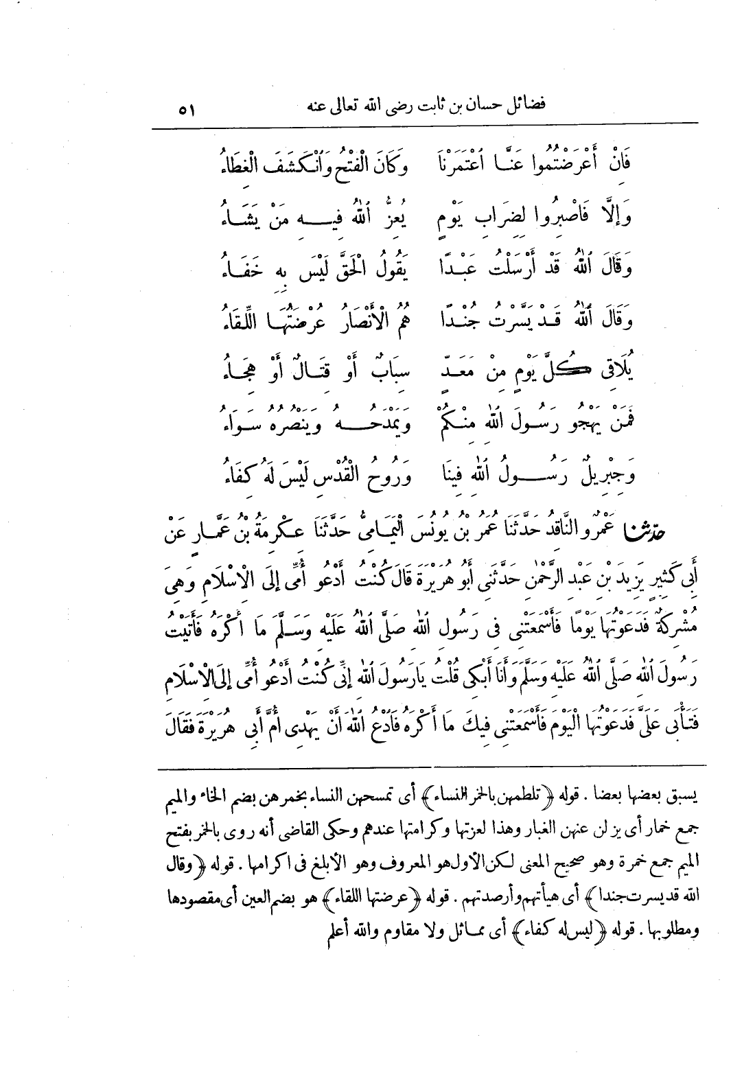 يَسْبِقُ بَعْضُهَا بَعْضًا قَوْلُهُ (تُلَطِّمُهُنَّ بِالْخُمُرِ النِّسَاءُ) أَيْ تَمْسَحُهُنَّ النِّسَاءُ بِخُمُرِهِنَّ بِضَمِّ الْخَاءِ وَالْمِيمِ جَمْعُ خِمَارٍ أَيْ يُزِلْنَ عَنْهُنَّ الْغُبَارَ وَهَذَا لِعَزَّتِهَا وَكَرَامَتِهَا عِنْدَهُمْ وَحَكَى الْقَاضِي أَنَّهُ رُوِيَ بِالْخَمْرِ بِفَتْحِ الْمِيمِ جَمْعُ خَمْرَةَ وَهُوَ صَحِيحُ الْمَعْنَى لَكِنَّ الْأَوَّلَ هُوَ الْمَعْرُوفُ وَهُوَ الْأَبْلَغُ فِي إِكْرَامِهَا قَوْلُهُ (وَقَالَ اللَّهُ قَدْ يَسَّرْتُ جُنْدًا) أَيْ هَيَّأْتُهُمْ وَأَرْصَدْتُهُمْ قَوْلُهُ (عُرْضَتُهَا اللِّقَاءُ) هُوَ بِضَمِّ الْعَيْنِ أَيْ مَقْصُودُهَا وَمَطْلُوبُهَا قَوْلُهُ (لَيْسَ لَهُ كِفَاءُ) أَيْ مُمَاثِلٌ وَلَا مُقَاوِمٌ والله اعلم