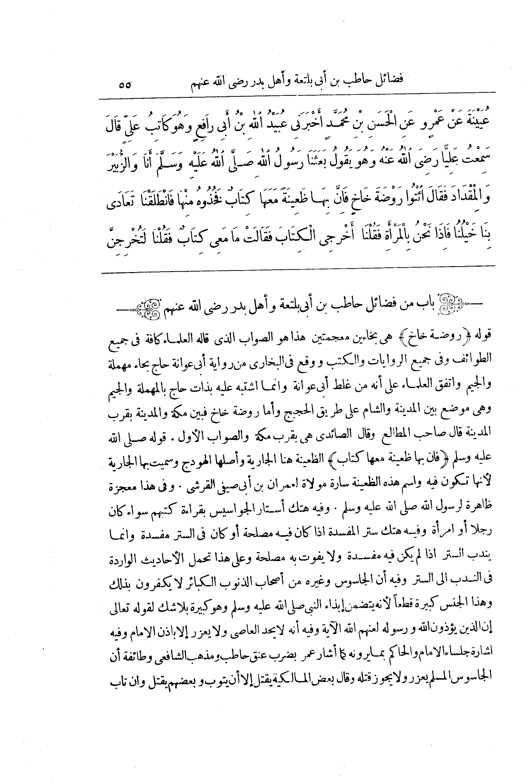 [2494] (رَوْضَةَ خَاخٍ) هِيَ بِخَاءَيْنِ مُعْجَمَتَيْنِ هَذَا هُوَ الصَّوَابُ الَّذِي قَالَهُ الْعُلَمَاءُ كَافَّةً فِي جَمِيعِ الطَّوَائِفِ وَفِي جَمِيعِ الرِّوَايَاتِ وَالْكُتُبِ وَوَقَعَ في البخاري من رواية أبي عوانة حاج بِحَاءٍ مُهْمَلَةٍ وَالْجِيمِ وَاتَّفَقَ الْعُلَمَاءُ عَلَى أَنَّهُ مِنْ غَلَطِ أَبِي عَوَانَةَ وَإِنَّمَا اشْتَبَهَ عَلَيْهِ بِذَاتِ حَاجٍّ بِالْمُهْمَلَةِ وَالْجِيمِ وَهِيَ مَوْضِعٌ بَيْنَ الْمَدِينَةِ وَالشَّامِ عَلَى طَرِيقِ الْحَجِيجِ وَأَمَّا رَوْضَةُ خَاخٍ فَبَيْنَ مَكَّةَ وَالْمَدِينَةِ بِقُرْبِ الْمَدِينَةِ قَالَ صَاحِبُ الْمَطَالِعِ وَقَالَ الصَّائِدِيُّ هِيَ بِقُرْبِ مَكَّةَ وَالصَّوَابُ الْأَوَّلُ قَوْلُهُ صَلَّى اللَّهُ عَلَيْهِ وَسَلَّمَ (فَإِنَّ بِهَا ظَعِينَةً مَعَهَا كِتَابٌ) الظَّعِينَةُ هُنَا الْجَارِيَةُ وَأَصْلُهَا الْهَوْدَجُ وَسُمِّيَتْ بِهَا الْجَارِيَةُ لِأَنَّهَا تَكُونُ فِيهِ وَاسْمُ هَذِهِ الظَّعِينَةُ سَارَةُ مَوْلَاةٌ لِعِمْرَانَ بْنِ أَبِي صَيْفِيٍّ الْقُرَشِيِّ وَفِي هَذَا مُعْجِزَةٌ ظَاهِرَةٌ لِرَسُولِ اللَّهِ صَلَّى اللَّهُ عَلَيْهِ وَسَلَّمَ وَفِيهِ هَتْكُ أَسْتَارِ الْجَوَاسِيسِ بِقِرَاءَةِ كُتُبِهِمْ سَوَاءٌ كَانَ رَجُلًا أَوْ امْرَأَةً وَفِيهِ هَتْكُ سِتْرِ الْمَفْسَدَةِ إِذَا كَانَ فِيهِ مَصْلَحَةٌ أَوْ كَانَ فِي السِّتْرِ مَفْسَدَةٌ وَإِنَّمَا يُنْدَبُ السِّتْرُ إِذَا لَمْ يَكُنْ فِيهِ مَفْسَدَةٌ وَلَا يَفُوتُ بِهِ مَصْلَحَةٌ وَعَلَى هَذَا تُحْمَلُ الْأَحَادِيثُ الْوَارِدَةُ فِي النَّدْبِ إِلَى السِّتْرِ وَفِيهِ أَنَّ الْجَاسُوسَ وَغَيْرَهُ مِنْ أَصْحَابِ الذُّنُوبِ الْكَبَائِرِ لَا يَكْفُرُونَ بِذَلِكَ وَهَذَا الْجِنْسُ كَبِيرَةٌ قَطْعًا لِأَنَّهُ يَتَضَمَّنُ إِيذَاءَ النَّبِيِّ صَلَّى اللَّهُ عَلَيْهِ وَسَلَّمَ وَهُوَ كبيرة بلا شك لقوله تَعَالَى إِنَّ الَّذِينَ يُؤْذُونَ اللَّهَ وَرَسُولَهُ لَعَنَهُمُ اللَّهُ الْآيَةَ وَفِيهِ أَنَّهُ لَا يُحَدُّ الْعَاصِي وَلَا يُعَزَّرُ إِلَّا بِإِذْنِ الْإِمَامِ وَفِيهِ إِشَارَةُ جُلَسَاءِ الْإِمَامِ وَالْحَاكِمِ بِمَا يَرَوْنَهُ كَمَا أَشَارَ عُمَرُ بِضَرْبِ عُنُقِ حَاطِبٍ وَمَذْهَبُ الشَّافِعِيِّ وَطَائِفَةٍ أَنَّ الْجَاسُوسَ الْمُسْلِمَ يُعَزَّرُ وَلَا يَجُوزُ قَتْلُهُ وَقَالَ بَعْضُ الْمَالِكِيَّةِ يُقْتَلُ إِلَّا أَنْ يَتُوبَ وَبَعْضُهُمْ يُقْتَلُ وَإِنْ تَابَ)
