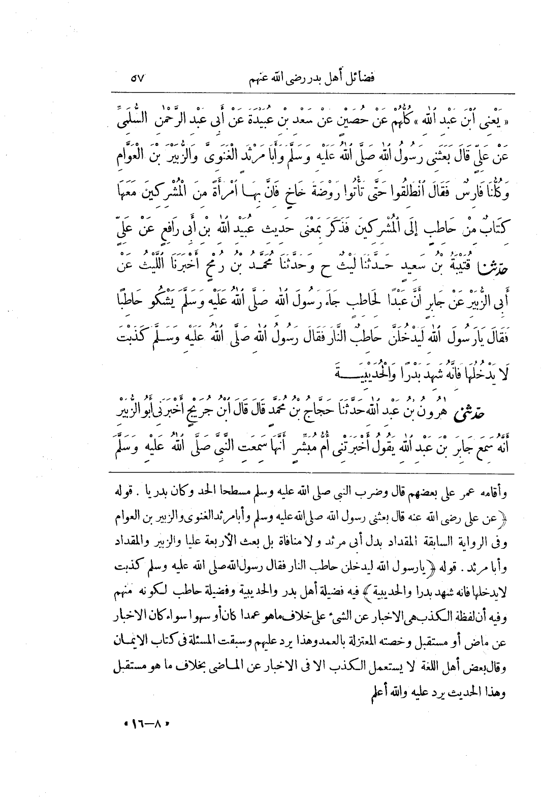 [2495] (يَا رَسُولَ اللَّهِ لَيَدْخُلَنَّ حَاطِبٌ النَّارَ فَقَالَ رَسُولُ اللَّهِ صَلَّى اللَّهُ عَلَيْهِ وَسَلَّمَ كَذَبْتَ لَا يَدْخُلُهَا فَإِنَّهُ شَهِدَ بَدْرًا وَالْحُدَيْبِيَةَ) فِيهِ فَضِيلَةُ أَهْلِ بَدْرٍ وَالْحُدَيْبِيَةِ وَفَضِيلَةُ حَاطِبٍ لِكَوْنِهِ مِنْهُمْ وَفِيهِ أَنَّ لفظة الكذب هي الاخبار عن الشئ عَلَى خِلَافِ مَا هُوَ عَمْدًا كَانَ أَوْ سَهْوًا سَوَاءٌ كَانَ الْإِخْبَارُ عَنْ مَاضٍ أَوْ مُسْتَقْبَلٍ وَخَصَّتْهُ الْمُعْتَزِلَةُ بِالْعَمْدِ وَهَذَا يَرُدُّ عَلَيْهِمْ وسبقت المسئلةفي كِتَابِ الْإِيمَانِ وَقَالَ بَعْضُ أَهْلِ اللُّغَةِ لَا يُسْتَعْمَلُ الْكَذِبُ إِلَّا فِي الْإِخْبَارِ عَنِ الْمَاضِي بخلاف مَا هُوَ مُسْتَقْبَلٌ وَهَذَا الْحَدِيثُ يَرُدُّ عَلَيْهِ والله اعلم