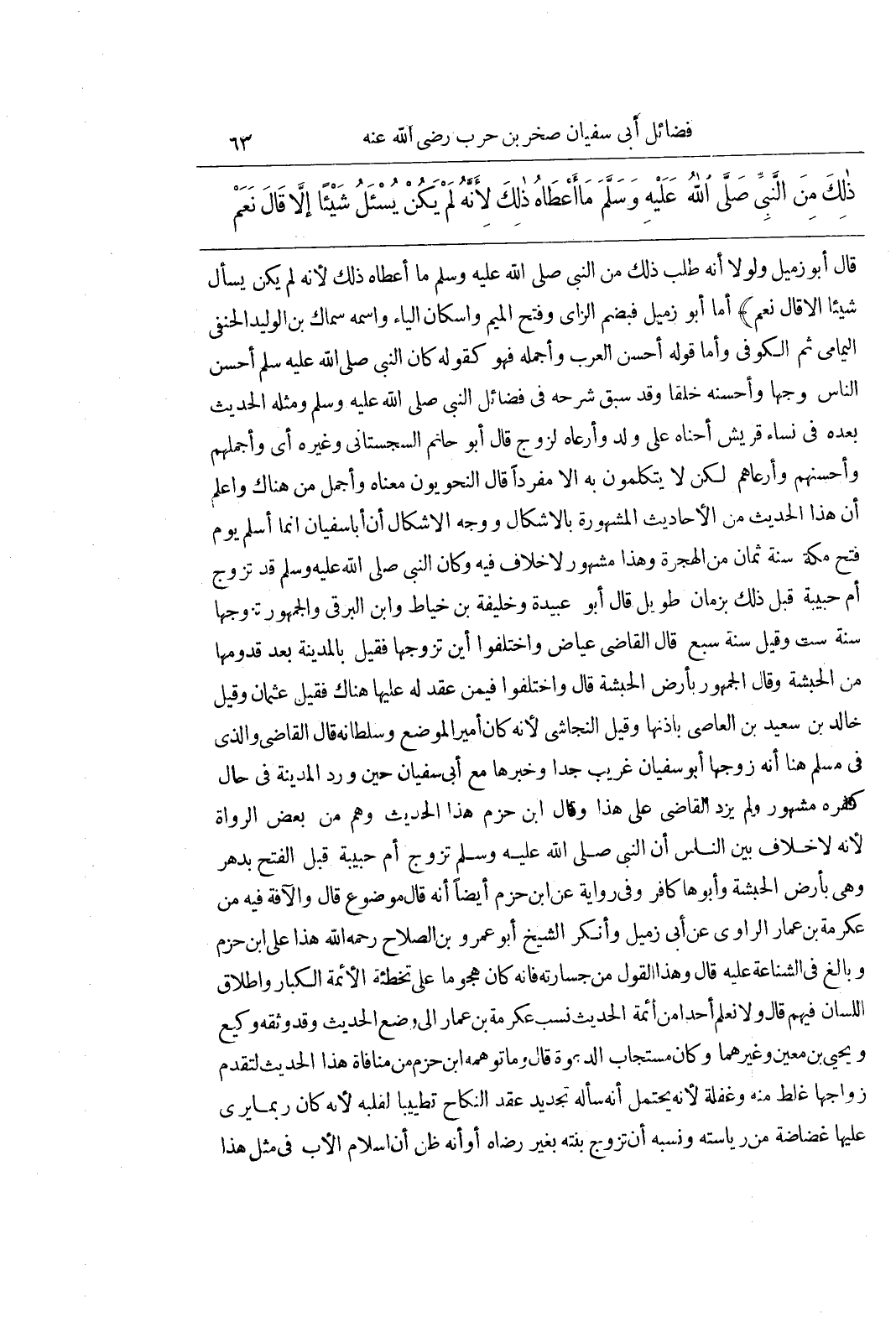 قَالَ أَبُو زُمَيْلٍ وَلَوْلَا أَنَّهُ طَلَبَ ذَلِكَ مِنَ النَّبِيِّ صَلَّى اللَّهُ عَلَيْهِ وَسَلَّمَ مَا أَعْطَاهُ ذَلِكَ لِأَنَّهُ لَمْ يَكُنْ يُسْأَلُ شَيْئًا إِلَّا قَالَ نَعَمْ) أَمَّا أَبُو زُمَيْلٍ فَبِضَمِّ الزَّايِ وَفَتْحِ الْمِيمِ وَإِسْكَانِ الْيَاءِ وَاسْمُهُ سِمَاكُ بْنُ الْوَلِيدِ الْحَنَفِيُّ الْيَمَامِيُّ ثُمَّ الْكُوفِيُّ وَأَمَّا قَوْلُهُ أَحْسَنُ الْعَرَبِ وَأَجْمَلُهُ فَهُوَ كَقَوْلِهِ كَانَ النَّبِيُّ صَلَّى اللَّهُ عَلَيْهِ وَسَلَّمَ أَحْسَنَ النَّاسِ وَجْهًا وَأَحْسَنُهُ خَلْقًا وَقَدْ سَبَقَ شَرْحُهُ فِي فَضَائِلِ النَّبِيِّ صَلَّى اللَّهُ عَلَيْهِ وَسَلَّمَ وَمِثْلُهُ الْحَدِيثُ بَعْدَهُ فِي نِسَاءِ قُرَيْشٍ أَحْنَاهُ عَلَى ولد وأرعاه لزوج قال أبوحاتم السِّجِسْتَانِيُّ وَغَيْرُهُ أَيْ وَأَجْمَلُهُمْ وَأَحْسَنُهُمْ وَأَرْعَاهُمْ لَكِنْ لَا يَتَكَلَّمُونَ بِهِ إِلَّا مُفْرَدًا قَالَ النَّحْوِيُّونَ مَعْنَاهُ وَأَجْمَلُ مَنْ هُنَاكَ وَاعْلَمْ أَنَّ هَذَا الحديث من الاحاديث المشهورةبالاشكال وَوَجْهُ الْإِشْكَالِ أَنَّ أَبَا سُفْيَانَ إِنَّمَا أَسْلَمَ يَوْمَ فَتْحِ مَكَّةَ سَنَةَ ثَمَانٍ مِنَ الْهِجْرَةِ وَهَذَا مَشْهُورٌ لَا خِلَافَ فِيهِ وَكَانَ النَّبِيُّ صَلَّى اللَّهُ عَلَيْهِ وَسَلَّمَ قَدْ تَزَوَّجَ أُمَّ حَبِيبَةَ قَبْلَ ذَلِكَ بِزَمَانٍ طَوِيلٍ قَالَ أَبُو عبيدة وخليفة بن خياط وبن الْبَرْقِيِّ وَالْجُمْهُورُ تَزَوَّجَهَا سَنَةَ سِتٍّ وَقِيلَ سَنَةَ سَبْعٍ قَالَ الْقَاضِي عِيَاضٌ وَاخْتَلَفُوا أَيْنَ تَزَوَّجَهَا فَقِيلَ بِالْمَدِينَةِ بَعْدَ قُدُومِهَا مِنَ الْحَبَشَةِ وَقَالَ الْجُمْهُورُ بِأَرْضِ الْحَبَشَةِ قَالَ وَاخْتَلَفُوا فِيمَنْ عَقَدَ لَهُ عَلَيْهَا هُنَاكَ فَقِيلَ عُثْمَانُ وَقِيلَ خَالِدُ بْنُ سَعِيدِ بْنِ الْعَاصِي بِإِذْنِهَا وَقِيلَ النَّجَاشِيُّ لِأَنَّهُ كَانَ أَمِيرَ الْمَوْضِعِ وَسُلْطَانِهِ قَالَ الْقَاضِي وَاَلَّذِي فِي مُسْلِمٍ هُنَا أَنَّهُ زَوَّجَهَا أَبُو سُفْيَانَ غَرِيبٌ جِدًّا وَخَبَرُهَا مَعَ أَبِي سُفْيَانَ حِينَ وَرَدَ الْمَدِينَةَ فِي حَالِ كُفْرِهِ مَشْهُورٌ ولم يزد القاضي على هذا وقال بن حَزْمٍ هَذَا الْحَدِيثُ وَهْمٌ مِنْ بَعْضِ الرُّوَاةِ لِأَنَّهُ لَا خِلَافَ بَيْنَ النَّاسِ أَنَّ النَّبِيَّ صَلَّى اللَّهُ عَلَيْهِ وَسَلَّمَ تَزَوَّجَ أُمَّ حَبِيبَةَ قَبْلَ الْفَتْحِ بِدَهْرٍ وَهِيَ بِأَرْضِ الْحَبَشَةِ وَأَبُوهَا كافر وفي رواية عن بن حَزْمٍ أَيْضًا أَنَّهُ قَالَ مَوْضُوعٌ قَالَ وَالْآفَةُ فِيهِ مِنْ عِكْرِمَةَ بْنِ عَمَّارٍ الرَّاوِي عَنْ أَبِي زُمَيْلٍ وَأَنْكَرَ الشَّيْخُ أَبُو عَمْرِو بْنُ الصَّلَاحِ رَحِمَهُ اللَّهُ هذا على بن حَزْمٍ وَبَالَغَ فِي الشَّنَاعَةِ عَلَيْهِ قَالَ وَهَذَا الْقَوْلُ مِنْ جَسَارَتِهِ فَإِنَّهُ كَانَ هَجُومًا عَلَى تَخْطِئَةِ الْأَئِمَّةِ الْكِبَارِ وَإِطْلَاقِ اللِّسَانِ فِيهِمْ قَالَ وَلَا نَعْلَمُ أَحَدًا مِنْ أَئِمَّةِ الْحَدِيثِ نَسَبَ عِكْرِمَةَ بْنَ عَمَّارٍ إِلَى وَضْعِ الْحَدِيثِ وَقَدْ وَثَّقَهُ وَكِيعٌ وَيَحْيَى بْنُ مَعِينٍ وَغَيْرُهُمَا وَكَانَ مستجاب الدعوة قال وما توهمه بن حَزْمٍ مِنْ مُنَافَاةِ هَذَا الْحَدِيثِ لِتَقَدُّمِ زَوَاجِهَا غَلَطٌ مِنْهُ وَغَفْلَةٌ لِأَنَّهُ يُحْتَمَلُ أَنَّهُ سَأَلَهُ تَجْدِيدَ عَقْدِ النِّكَاحِ تَطْيِيبًا لِقَلْبِهِ لِأَنَّهُ كَانَ رُبَّمَا يَرَى عَلَيْهَا غَضَاضَةً مِنْ رِيَاسَتِهِ وَنَسَبِهِ أن تزوج بنته بِغَيْرِ رِضَاهُ أَوْ أَنَّهُ ظَنَّ أَنَّ إِسْلَامَ الْأَبِ فِي مِثْلِ هَذَا
