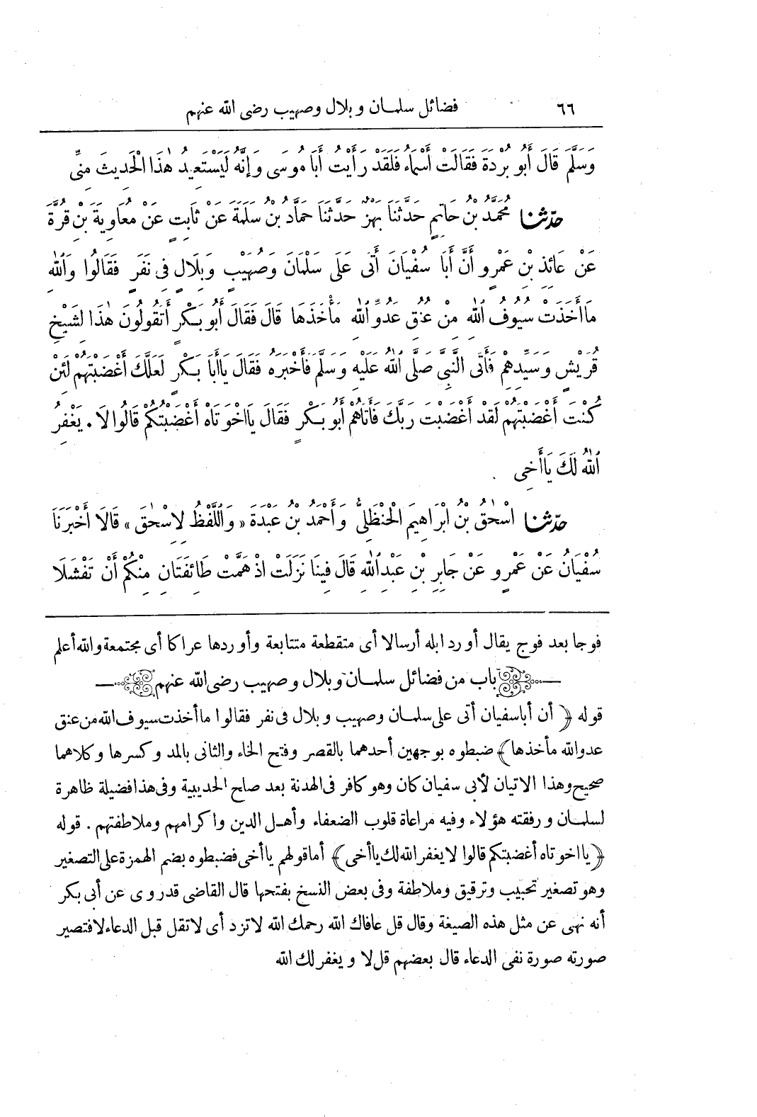 [2504] (أَنَّ أَبَا سُفْيَانَ أَتَى عَلَى سَلْمَانَ وَصُهَيْبٍ وَبِلَالٍ فِي نَفَرٍ فَقَالُوا مَا أَخَذَتْ سُيُوفُ اللَّهِ مِنْ عُنُقِ عَدُوِّ اللَّهِ مَأْخَذَهَا) ضَبَطُوهُ بِوَجْهَيْنِ أَحَدُهُمَا بِالْقَصْرِ وَفَتْحِ الْخَاءِ وَالثَّانِي بِالْمَدِّ وَكَسْرِهَا وَكِلَاهُمَا صَحِيحٌ وَهَذَا الْإِتْيَانُ لِأَبِي سُفْيَانَ كَانَ وَهُوَ كَافِرٌ فِي الْهُدْنَةِ بَعْدَ صُلْحِ الْحُدَيْبِيَةِ وَفِي هَذَا فَضِيلَةٌ ظَاهِرَةٌ لِسَلْمَانَ وَرُفْقَتِهِ هَؤُلَاءِ وَفِيهِ مُرَاعَاةُ قُلُوبِ الضُّعَفَاءِ وَأَهْلِ الدِّينِ وَإِكْرَامِهِمْ وَمُلَاطَفَتِهِمْ قَوْلُهُ (يَا إِخْوَتَاهُ أغضبتكم قالوا لا يغفر الله لك ياأخي) أما قولهم ياأخي فَضَبَطُوهُ بِضَمِّ الْهَمْزَةِ عَلَى التَّصْغِيرِ وَهُوَ تَصْغِيرُ تَحْبِيبٍ وَتَرْقِيقٌ وَمُلَاطَفَةٌ وَفِي بَعْضِ النُّسَخِ بِفَتْحِهَا قَالَ الْقَاضِي قَدْ رُوِيَ عَنْ أَبِي بَكْرٍ أَنَّهُ نَهَى عَنْ مِثْلِ هَذِهِ الصِّيغَةِ وَقَالَ قُلْ عَافَاكَ اللَّهُ رَحِمَكَ اللَّهُ لَا تَزِدْ أَيْ لَا تَقُلْ قَبْلَ الدُّعَاءِ لَا فَتَصِيرُ صُورَتُهُ صُورَةَ نَفْيِ الدُّعَاءِ قَالَ بَعْضُهُمْ قُلْ لَا وَيَغْفِرُ لَكَ اللَّهُ