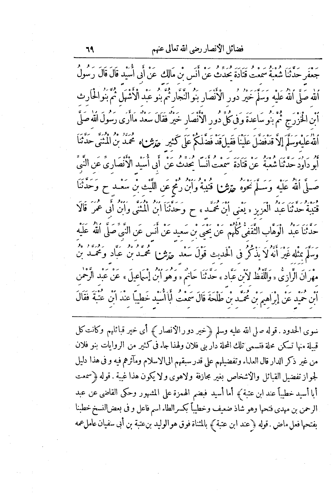 [2512] (خَيْرُ دُورِ الْأَنْصَارِ) أَيْ خَيْرُ قَبَائِلِهِمْ وَكَانَتْ كُلُّ قَبِيلَةٍ مِنْهَا تَسْكُنُ مَحَلَّةً فَتُسَمَّى تِلْكَ الْمَحَلَّةُ دَارَ بني فلان ولهذاجاء فِي كَثِيرٍ مِنَ الرِّوَايَاتِ بَنُو فُلَانٍ مِنْ غَيْرِ ذِكْرِ الدَّارِ قَالَ الْعُلَمَاءُ وَتَفْضِيلِهِمْ عَلَى قَدْرِ سَبْقِهِمْ إِلَى الْإِسْلَامِ وَمَآثِرَهِمْ فِيهِ وَفِي هَذَا دَلِيلٌ لِجَوَازِ تَفْضِيلِ الْقَبَائِلِ وَالْأَشْخَاصِ بِغَيْرِ مُجَازَفَةٍ وَلَا هَوًى وَلَا يَكُونُ هَذَا غِيبَةً قوله (سمعت أبا أسيد خطيبا عند بن عُتْبَةَ) أَمَّا أُسَيْدٌ فَبِضَمِّ الْهَمْزَةِ عَلَى الْمَشْهُورِ وَحَكَى الْقَاضِي عَنْ عَبْدِ الرَّحْمَنِ بْنِ مَهْدِيٍّ فَتْحَهَا وَهُوَ شَاذٌّ ضَعِيفٌ وَخَطِيبًا بِكَسْرِ الطَّاءِ اسْمُ فَاعِلٍ وَفِي بَعْضِ النُّسَخِ خَطَبَنَا بِفَتْحِهَا فعل ماض قوله (عند بن عُتْبَةَ) بِالْمُثَنَّاةِ فَوْقُ هُوَ الْوَلِيدُ بْنُ عُتْبَةَ بْنِ أَبِي سُفْيَانَ عَامِلُ عَمِّهِ