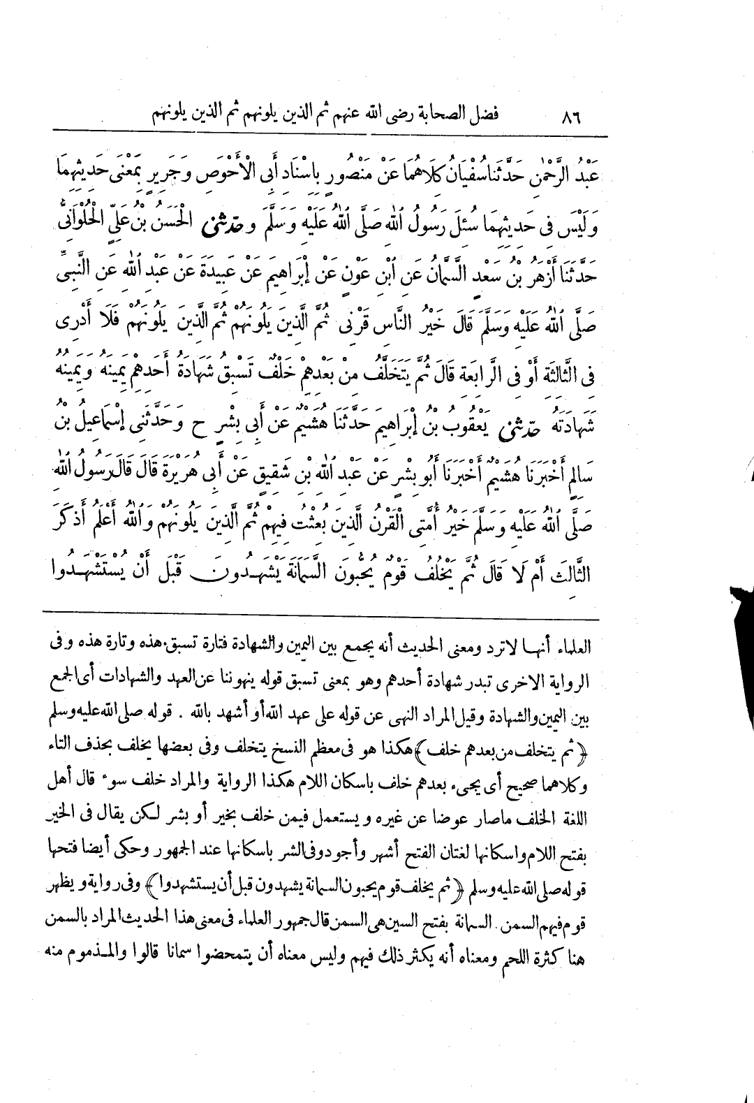 العلماء أنها لاترد وَمَعْنَى الْحَدِيثِ أَنَّهُ يُجْمَعُ بَيْنَ الْيَمِينِ وَالشَّهَادَةِ فَتَارَةً تَسْبِقُ هَذِهِ وَتَارَةً هَذِهِ وَفِي الرِّوَايَةِ الاخرى تبدر شهادة أحدهم وهو يعنى تَسْبِقُ قَوْلُهُ يَنْهَوْنَنَا عَنِ الْعَهْدِ وَالشَّهَادَاتِ أَيِ الْجَمْعِ بَيْنَ الْيَمِينِ وَالشَّهَادَةِ وَقِيلَ الْمُرَادُ النَّهْيُ عَنْ قَوْلِهِ عَلَى عَهْدِ اللَّهِ أَوْ أَشْهَدُ بِاَللَّهِ قَوْلُهُ صَلَّى اللَّهُ عَلَيْهِ وَسَلَّمَ (ثُمَّ يَتَخَلَّفُ مِنْ بَعْدِهِمْ خَلْفٌ) هَكَذَا هُوَ فِي مُعْظَمِ النُّسَخِ يَتَخَلَّفُ وَفِي بَعْضِهَا يَخْلُفُ بِحَذْفِ التاء وكلاهما صحيح أي يجئ بَعْدَهُمْ خَلْفٌ بِإِسْكَانِ اللَّامِ هَكَذَا الرِّوَايَةُ وَالْمُرَادُ خَلْفُ سُوءٍ قَالَ أَهْلُ اللُّغَةِ الْخَلْفُ مَا صَارَ عِوَضًا عَنْ غَيْرِهِ وَيُسْتَعْمَلُ فِيمَنْ خَلَفَ بِخَيْرٍ أَوْ بِشَرٍّ لَكِنْ يُقَالُ فِي الْخَيْرِ بِفَتْحِ اللَّامِ وَإِسْكَانِهَا لُغَتَانِ الْفَتْحُ أَشْهَرُ وَأَجْوَدُ وفي الشر باسكانها عن الْجُمْهُورِ وَحُكِيَ أَيْضًا فَتْحُهَا قَوْلُهُ صَلَّى اللَّهُ عَلَيْهِ وَسَلَّمَ