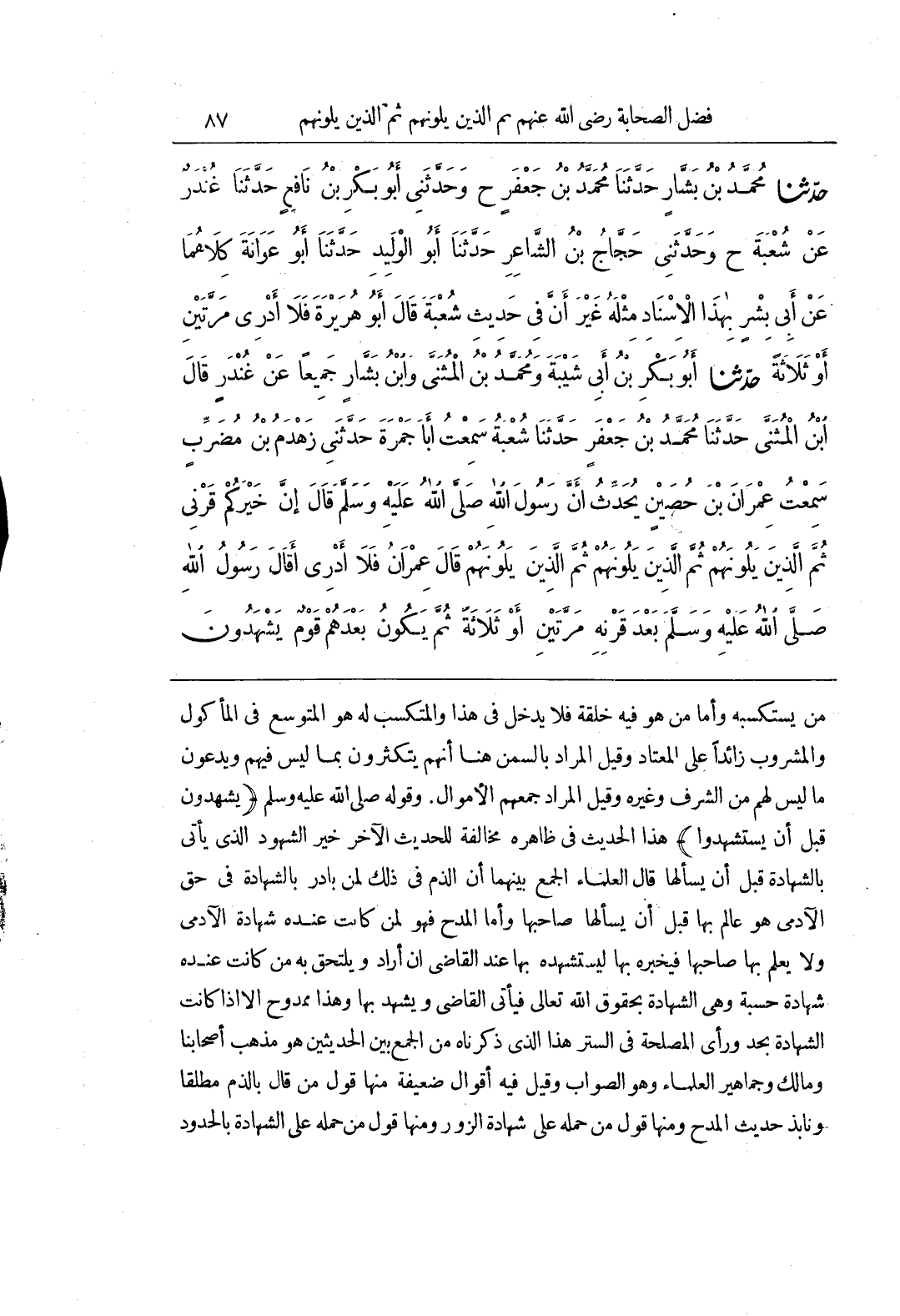 مَنْ يَسْتَكْسِبُهُ وَأَمَّا مَنْ هُوَ فِيهِ خِلْقَةً فَلَا يَدْخُلُ فِي هَذَا وَالْمُتَكَسِّبُ لَهُ هُوَ الْمُتَوَسِّعُ فِي الْمَأْكُولِ وَالْمَشْرُوبِ زَائِدًا عَلَى الْمُعْتَادِ وَقِيلَ الْمُرَادُ بِالسِّمَنِ هُنَا أَنَّهُمْ يَتَكَثَّرُونَ بِمَا لَيْسَ فِيهِمْ وَيَدَّعُونَ مَا لَيْسَ لَهُمْ مِنَ الشَّرَفِ وَغَيْرَهِ وَقِيلَ الْمُرَادُ جَمْعُهُمُ الْأَمْوَالَ وَقَوْلُهُ صَلَّى اللَّهُ عَلَيْهِ وَسَلَّمَ (يَشْهَدُونَ قَبْلَ أَنْ يُسْتَشْهَدُوا) هَذَا الْحَدِيثُ فِي ظَاهِرِهِ مُخَالَفَةٌ لِلْحَدِيثِ الْآخَرِ خَيْرُ الشُّهُودِ الَّذِي يَأْتِي بِالشَّهَادَةِ قَبْلَ أَنْ يُسْأَلَهَا قَالَ الْعُلَمَاءُ الْجَمْعُ بَيْنَهُمَا أَنَّ الذَّمَّ فِي ذَلِكَ لِمَنْ بَادَرَ بِالشَّهَادَةِ فِي حق الآدمي هو عالم بها قَبْلَ أَنْ يَسْأَلَهَا صَاحِبُهَا وَأَمَّا الْمَدْحُ فَهُوَ لِمَنْ كَانَتْ عِنْدَهُ شَهَادَةُ الْآدَمِيِّ وَلَا يَعْلَمُ بها صاحبها فيخبره بها ليستشهد بِهَا عِنْدَ الْقَاضِي إِنْ أَرَادَ وَيَلْتَحِقُ بِهِ مَنْ كَانَتْ عِنْدَهُ شَهَادَةُ حِسْبَةٍ وَهِيَ الشَّهَادَةُ بِحُقُوقِ اللَّهِ تَعَالَى فَيَأْتِي الْقَاضِيَ وَيَشْهَدُ بِهَا وَهَذَا مَمْدُوحٌ إِلَّا إِذَا كَانَتِ الشَّهَادَةُ بِحَدٍّ وَرَأَى الْمَصْلَحَةَ فِي السِّتْرِ هَذَا الَّذِي ذَكَرْنَاهُ مِنَ الْجَمْعِ بَيْنَ الْحَدِيثَيْنِ هُوَ مَذْهَبُ أَصْحَابِنَا وَمَالِكٍ وَجَمَاهِيرِ الْعُلَمَاءِ وَهُوَ الصَّوَابُ وَقِيلَ فِيهِ اقوال ضعيفة منها قَوْلِ مَنْ قَالَ بِالذَّمِّ مُطْلَقًا وَنَابَذَ حَدِيثَ المدح ومنها مَنْ حَمَلَهُ عَلَى شَهَادَةِ الزُّورِ وَمِنْهَا قَوْلُ مَنْ حَمَلَهُ عَلَى الشَّهَادَةِ بِالْحُدُودِ