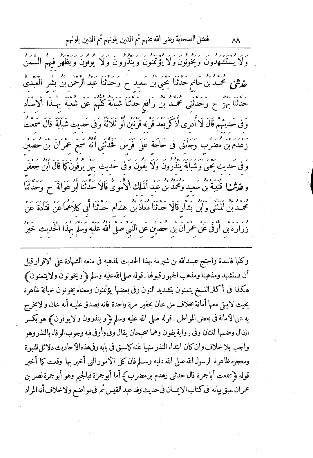 [2535] (وَيَخُونُونَ وَلَا يَتَمَنَّوْنَ) هَكَذَا فِي أَكْثَرِ النُّسَخِ يَتَمَنَّوْنَ بِتَشْدِيدِ النُّونِ وَفِي بَعْضِهَا يُؤْتَمَنُونَ وَمَعْنَاهُ يَخُونُونَ خِيَانَةً ظَاهِرَةً بِحَيْثُ لَا يَبْقَى مَعَهَا أَمَانَةٌ بِخِلَافِ مَنْ خَانَ بِحَقِيرٍ مَرَّةً وَاحِدَةً فَإِنَّهُ يَصْدُقُ عَلَيْهِ أَنَّهُ خَانَ وَلَا يَخْرُجُ بِهِ عَنِ الْأَمَانَةِ فِي بَعْضِ الْمَوَاطِنِ قَوْلُهُ صَلَّى الله عليه وسلم (وينذرون ولا يوفون) هوبكسر الذَّالِ وَضَمِّهَا لُغَتَانِ وَفِي رِوَايَةٍ يَفُونَ وَهُمَا صَحِيحَانِ يُقَالُ وَفَى وَأَوْفَى فِيهِ وُجُوبُ الْوَفَاءِ بِالنَّذْرِ وَهُوَ وَاجِبٌ بِلَا خِلَافٍ وَإِنْ كَانَ ابْتِدَاءُ النَّذْرِ مَنْهِيًّا عَنْهُ كَمَا سَبَقَ فِي بَابِهِ وَفِي هَذِهِ الْأَحَادِيثِ دَلَائِلُ لِلنُّبُوَّةِ وَمُعْجِزَةٌ ظَاهِرَةٌ لِرَسُولِ اللَّهِ صَلَّى اللَّهُ عَلَيْهِ وَسَلَّمَ فَإِنَّ كُلَّ الْأُمُورِ الَّتِي أَخْبَرَ بِهَا وَقَعَتْ كَمَا أَخْبَرَ قَوْلُهُ (سَمِعْتُ أَبَا جَمْرَةَ قَالَ حَدَّثَنِي زَهْدَمُ بْنُ مُضَرِّبٍ) أَمَّا أَبُو جَمْرَةَ فَبِالْجِيمِ وَهُوَ أَبُو جَمْرَةَ نصْرُ بْنُ عِمْرَانَ سَبَقَ بَيَانُهُ فِي كِتَابِ الْإِيمَانِ فِي حَدِيثِ وَفْدِ عَبْدِ الْقَيْسِ ثُمَّ فِي مَوَاضِعَ وَلَا خلاف أنه المراد