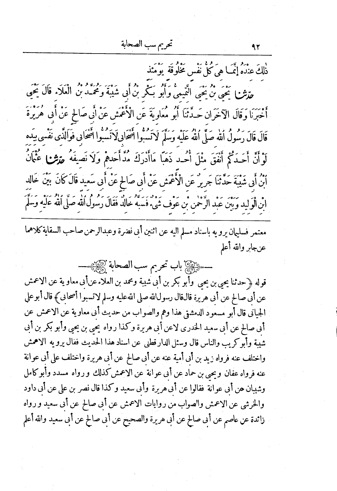 [2540] (حَدَّثَنَا يَحْيَى بْنُ يَحْيَى وَأَبُو بَكْرِ بْنُ أَبِي شَيْبَةَ وَمُحَمَّدُ بْنُ الْعَلَاءِ عَنْ أَبِي مُعَاوِيَةَ عَنِ الْأَعْمَشِ عَنْ أَبِي صَالِحٍ عَنْ أَبِي هُرَيْرَةَ قَالَ قَالَ رَسُولُ اللَّهِ صَلَّى اللَّهُ عَلَيْهِ وَسَلَّمَ لَا تَسُبُّوا أَصْحَابِي) قَالَ أَبُو عَلِيٍّ الْجَيَّانِيِّ قَالَ أَبُو مَسْعُودٍ الدِّمَشْقِيِّ هَذَا وَهَمٌ وَالصَّوَابُ مِنْ حَدِيثِ أَبِي مُعَاوِيَةَ عَنِ الْأَعْمَشِ عَنْ أَبِي صَالِحٍ عَنْ أَبِي سَعِيدٍ الْخُدْرِيِّ لَا عَنْ أَبِي هُرَيْرَةَ وَكَذَا رَوَاهُ يَحْيَى بْنُ يَحْيَى وَأَبُو بَكْرِ بْنُ أَبِي شَيْبَةَ وَأَبُو كُرَيْبٍ وَالنَّاسُ قَالَ وَسُئِلَ الدَّارَقُطْنِيُّ عَنْ إِسْنَادِ هَذَا الْحَدِيثِ فَقَالَ يَرْوِيهِ الْأَعْمَشُ وَاخْتُلِفَ عَنْهُ فَرَوَاهُ زَيْدُ بْنُ أَبِي أُمَيَّةَ عَنْهُ عَنْ أَبِي صَالِحٍ عَنْ أَبِي هُرَيْرَةَ وَاخْتُلِفَ عَلَى أَبِي عَوَانَةَ عَنْهُ فَرَوَاهُ عَفَّانُ وَيَحْيَى بْنُ حَمَّادٍ عَنْ أَبِي عَوَانَةَ عَنِ الْأَعْمَشِ كَذَلِكَ وَرَوَاهُ مُسَدَّدٌ وَأَبُو كَامِلٍ وَشَيْبَانُ عَنْ أَبِي عَوَانَةَ فَقَالُوا عَنْ أَبِي هُرَيْرَةَ وَأَبِي سَعِيدٍ وَكَذَا قَالَ نَصْرُ بْنُ عَلِيٍّ عَنْ أَبِي دَاوُدَ وَالْخَرَشِيِّ عَنِ الْأَعْمَشِ وَالصَّوَابُ مِنْ رِوَايَاتِ الْأَعْمَشِ عَنْ أَبِي صَالِحٍ عَنْ أَبِي سَعِيدٍ وَرَوَاهُ زَائِدَةُ عَنْ عَاصِمٍ عَنْ أَبِي صَالِحٍ عَنْ أَبِي هُرَيْرَةَ وَالصَّحِيحُ عَنْ أَبِي صَالِحٍ عَنْ أَبِي سَعِيدٍ والله اعلم