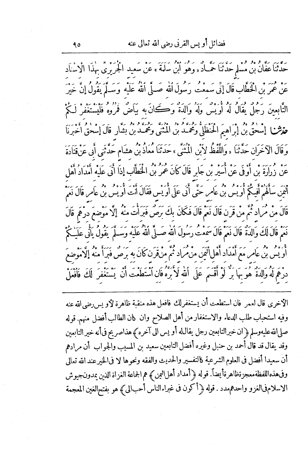 الْأُخْرَى قَالَ لِعُمَرَ فَإِنْ اسْتَطَعْتَ أَنْ يَسْتَغْفِرَ لَكَ فَافْعَلْ هَذِهِ مَنْقَبَةٌ ظَاهِرَةٌ لِأُوَيْسٍ رَضِيَ اللَّهُ عَنْهُ وَفِيهِ اسْتِحْبَابُ طَلَبِ الدُّعَاءِ وَالِاسْتِغْفَارِ مِنْ أَهْلِ الصَّلَاحِ وَإِنْ كَانَ الطَّالِبُ أَفْضَلَ مِنْهُمْ قَوْلُهُ صَلَّى اللَّهُ عَلَيْهِ وَسَلَّمَ (إِنَّ خَيْرَ التَّابِعِينَ رَجُلٌ يُقَالُ لَهُ أُوَيْسٌ إِلَى آخِرِهِ) هَذَا صَرِيحٌ فِي أَنَّهُ خَيْرُ التَّابِعِينَ وَقَدْ يُقَالُ قَدْ قَالَ أَحْمَدُ بْنُ حَنْبَلٍ وَغَيْرُهُ أَفْضَلُ التَّابِعِينَ سَعِيدُ بْنُ الْمُسَيَّبِ وَالْجَوَابُ أَنَّ مُرَادَهُمْ أَنَّ سَعِيدًا أَفْضَلَ فِي الْعُلُومِ الشَّرْعِيَّةِ كَالتَّفْسِيرِ وَالْحَدِيثِ وَالْفِقْهِ وَنَحْوِهَا لَا فِي الْخَيْرِ عِنْدَ اللَّهِ تَعَالَى وَفِي هَذِهِ اللَّفْظَةِ مُعْجِزَةٌ ظَاهِرَةٌ أَيْضًا قَوْلُهُ (أَمْدَادُ أَهْلِ الْيَمَنِ) هُمُ الْجَمَاعَةُ الْغُزَاةُ الَّذِينَ يَمُدُّونَ جُيُوشَ الْإِسْلَامِ فِي الْغَزْوِ وَاحِدُهُمْ مَدَدٌ قَوْلُهُ (أَكُونُ فِي غَبْرَاءِ النَّاسِ أَحَبُّ إِلَيَّ) هُوَ بِفَتْحِ الْغَيْنِ المعجمة