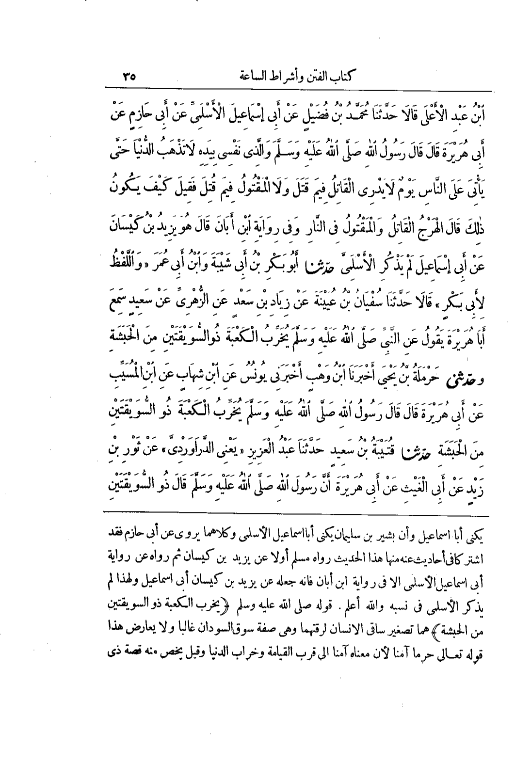 [2909] قَوْلُهُ صَلَّى اللَّهُ عَلَيْهِ وَسَلَّمَ (يُخَرِّبُ الْكَعْبَةَ ذُو السُّوَيْقَتَيْنِ مِنَ الْحَبَشَةِ) هُمَا تَصْغِيرُ سَاقَيِ الْإِنْسَانِ لِرِقَّتِهِمَا وَهِيَ صِفَةُ سوق السودان غالبا ولايعارض هذا قوله تعالى حرما آمنا لِأَنَّ مَعْنَاهُ آمِنًا إِلَى قُرْبِ الْقِيَامَةِ وَخَرَابِ الدُّنْيَا وَقِيلَ يُخَصُّ مِنْهُ قِصَّةُ ذِي