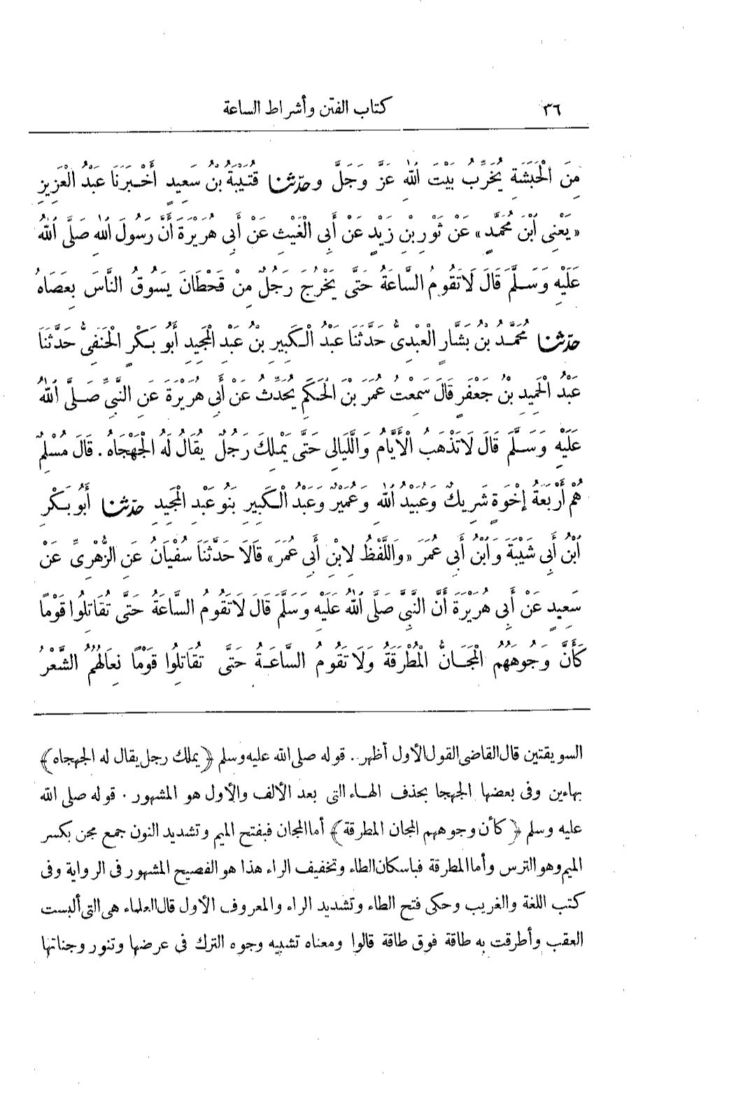 [2912] قَوْلُهُ صَلَّى اللَّهُ عَلَيْهِ وَسَلَّمَ (كَأَنَّ وُجُوهَهُمُ الْمَجَانُّ الْمُطْرَقَةُ) أَمَّا الْمَجَانُّ فَبِفَتْحِ الْمِيمِ وَتَشْدِيدِ النُّونِ جَمْعُ مِجَنٍّ بِكَسْرِ الْمِيمِ وَهُوَ التُّرْسُ وَأَمَّا الْمُطْرَقَةُ فَبِإِسْكَانِ الطَّاءِ وَتَخْفِيفِ الرَّاءِ هَذَا هُوَ الْفَصِيحُ الْمَشْهُورُ فِي الرِّوَايَةِ وَفِي كُتُبِ اللُّغَةِ وَالْغَرِيبِ وَحُكِي فَتْحُ الطَّاءِ وَتَشْدِيدُ الرَّاءِ وَالْمَعْرُوفُ الْأَوَّلُ قَالَ الْعُلَمَاءُ هِيَ الَّتِي أُلْبِسَتِ الْعَقِبُ وَأَطْرَقَتْ بِهِ طَاقَةً فَوْقَ طَاقَةٍ قَالُوا وَمَعْنَاهُ تَشْبِيهُ وُجُوهِ التُّرْكِ فِي عَرْضِهَا وَتَنَوُّرِ وجناتها
