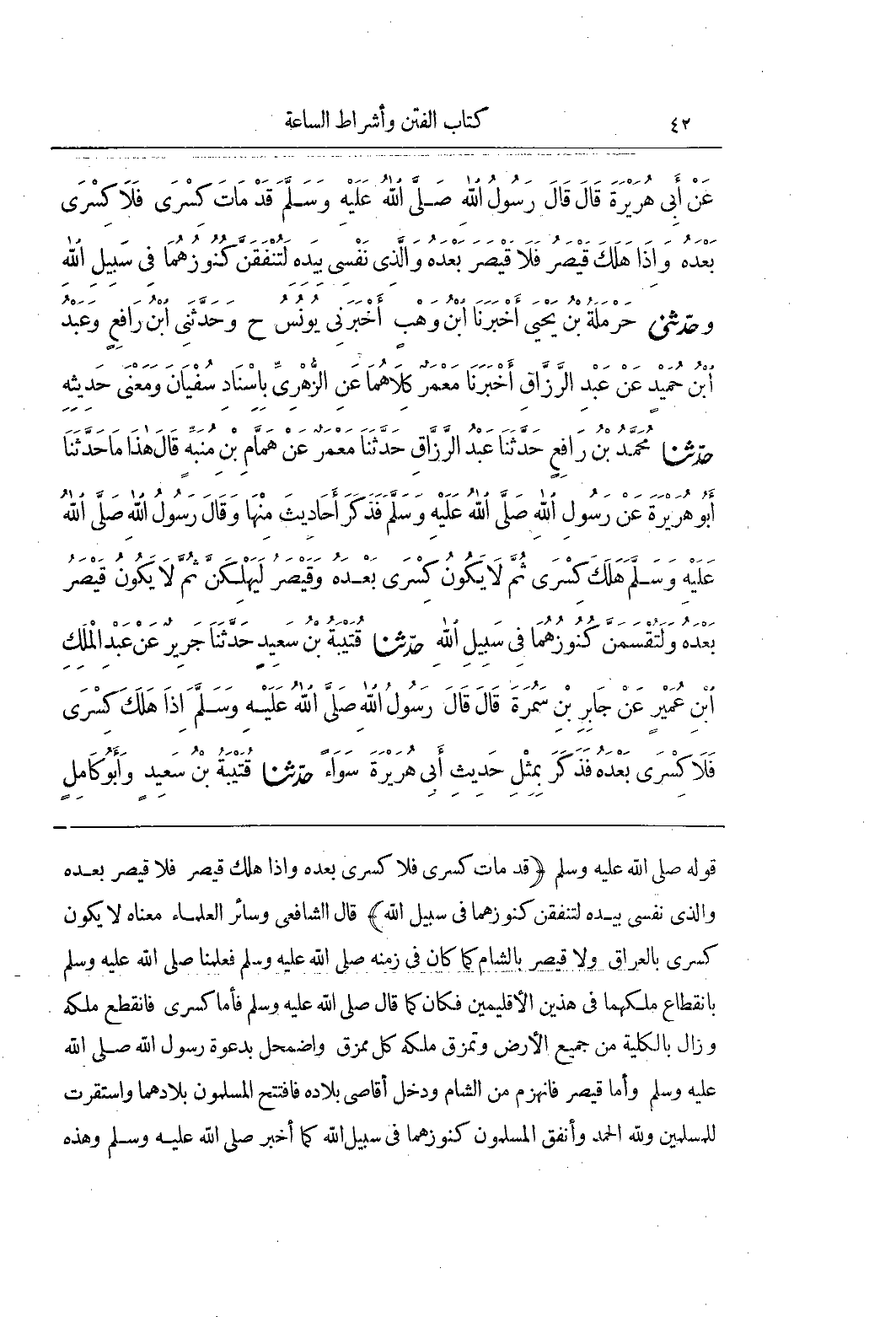 [2918] قَوْلُهُ صَلَّى اللَّهُ عَلَيْهِ وَسَلَّمَ (قَدْ مَاتَ كسرى فلاكسرى بَعْدَهُ وَإِذَا هَلَكَ قَيْصَرُ فَلَا قَيْصَرَ بَعْدَهُ وَاَلَّذِي نَفْسِي بِيَدِهِ لَتُنْفِقُنَّ كُنُوزَهُمَا فِي سَبِيلِ الله) قال الشافعى وسائر العلماء معناه لايكون كسرى بالعراق ولاقيصر بِالشَّامِ كَمَا كَانَ فِي زَمَنِهِ صَلَّى اللَّهُ عَلَيْهِ وَسَلَّمَ فَعَلَّمَنَا صَلَّى اللَّهُ عَلَيْهِ وَسَلَّمَ بِانْقِطَاعِ مُلْكِهِمَا فِي هَذَيْنِ الْإِقْلِيمَيْنِ فَكَانَ كَمَا قَالَ صَلَّى اللَّهُ عَلَيْهِ وَسَلَّمَ فَأَمَّا كِسْرَى فَانْقَطَعَ مُلْكُهُ وَزَالَ بِالْكُلِّيَّةِ مِنْ جَمِيعِ الْأَرْضِ وَتَمَزَّقَ مُلْكُهُ كُلَّ مُمَزَّقٍ وَاضْمَحَلَّ بِدَعْوَةِ رَسُولِ اللَّهِ صَلَّى اللَّهُ عَلَيْهِ وَسَلَّمَ وَأَمَّا قَيْصَرُ فَانْهَزَمَ مِنَ الشَّامِ وَدَخَلَ أَقَاصِي بِلَادِهِ فَافْتَتَحَ الْمُسْلِمُونَ بِلَادَهُمَا وَاسْتَقَرَّتْ لِلْمُسْلِمِينَ وَلِلَّهِ الْحَمْدُ وَأَنْفَقَ الْمُسْلِمُونَ كُنُوزَهُمَا فِي سَبِيلِ اللَّهِ كَمَا أَخْبَرَ صَلَّى اللَّهُ عَلَيْهِ وَسَلَّمَ وَهَذِهِ