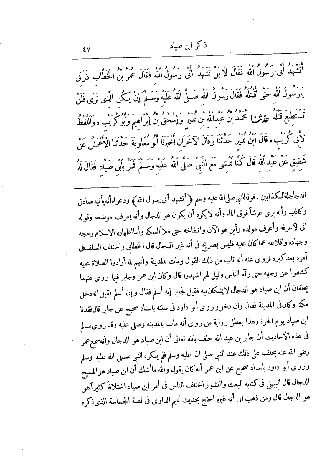 الدَّجَاجِلَةِ الْكَذَّابِينَ قَوْلُهُ لِلنَّبِيِّ صَلَّى اللَّهُ عَلَيْهِ وَسَلَّمَ (أَتَشْهَدُ أَنِّي رَسُولُ اللَّهِ) وَدَعْوَاهُ أَنَّهُ يَأْتِيهِ صَادِقٌ وَكَاذِبٌ وَأَنَّهُ يَرَى عَرْشًا فَوْقَ الماء وأنه لايكره أَنْ يَكُونَ هُوَ الدَّجَّالُ وَأَنَّهُ يَعْرِفُ مَوْضِعَهُ وَقَوْلُهُ إِنِّي لَأَعْرِفُهُ وَأَعْرِفُ مَوْلِدَهُ وَأَيْنَ هُوَ الْآنَ وَانْتِفَاخُهُ حَتَّى مَلَأَ السِّكَّةَ وَأَمَّا إِظْهَارُهُ الْإِسْلَامَ وَحَجُّهُ وَجِهَادُهُ وَإِقْلَاعُهُ عَمَّا كَانَ عَلَيْهِ فَلَيْسَ بِصَرِيحٍ فِي أَنَّهُ غَيْرَ الدَّجَّالِ قَالَ الْخَطَّابِيُّ وَاخْتَلَفَ السَّلَفُ فِي أَمْرِهِ بَعْدَ كِبَرِهِ فَرُوِيَ عَنْهُ أَنَّهُ تَابَ مِنْ ذَلِكَ الْقَوْلِ وَمَاتَ بِالْمَدِينَةِ وَأَنَّهُمْ لَمَّا أَرَادُوا الصَّلَاةَ عَلَيْهِ كَشَفُوا عَنْ وَجْهِهِ حَتَّى رَآهُ النَّاسُ وَقِيلَ لهم اشهدوا قال وكان بن عُمَرَ وَجَابِرٌ فِيمَا رُوِيَ عَنْهُمَا يَحْلِفَانِ أَنَّ بن صياد هو الدجال لايشكان فِيهِ فَقِيلَ لِجَابِرٍ إِنَّهُ أَسْلَمَ فَقَالَ وَإِنْ أَسْلَمَ فَقِيلَ إِنَّهُ دَخَلَ مَكَّةَ وَكَانَ فِي الْمَدِينَةِ فَقَالَ وَإِنْ دَخَلَ وَرَوَى أَبُو دَاوُدَ فِي سُنَنِهِ بِإِسْنَادٍ صَحِيحٍ عَنْ جَابِرٍ قَالَ فقدنا بن صَيَّادٍ يَوْمَ الْحَرَّةِ وَهَذَا يُعَطِّلُ رِوَايَةَ مَنْ رَوَى أَنَّهُ مَاتَ بِالْمَدِينَةِ وَصُلِّيَ عَلَيْهِ وَقَدْ رَوَى مُسْلِمٌ فِي هَذِهِ الْأَحَادِيثِ أَنَّ جَابِرَ بْنَ عَبْدِ اللَّهِ حَلَفَ بِاَللَّهِ تَعَالَى أَنَّ بن صَيَّادٍ هُوَ الدَّجَّالُ وَأَنَّهُ سَمِعَ عُمَرَ رَضِيَ اللَّهُ عَنْهُ يَحْلِفُ عَلَى ذَلِكَ عِنْدَ النَّبِيِّ صَلَّى اللَّهُ عَلَيْهِ وَسَلَّمَ فَلَمْ يُنْكِرْهُ النَّبِيُّ صَلَّى اللَّهُ عَلَيْهِ وَسَلَّمَ وَرَوَى أَبُو دَاوُدَ باسناد صحيح عن بن عمر أنه كان يقول والله ماأشك أن بن صَيَّادٍ هُوَ الْمَسِيحُ الدَّجَّالُ قَالَ الْبَيْهَقِيُّ فِي كِتَابِهِ الْبَعْثِ وَالنُّشُورِ اخْتَلَفَ النَّاسُ فِي أَمْرِ بن صياد اختلافا كثيرا هل هو الدجال قال وَمَنْ ذَهَبَ إِلَى أَنَّهُ غَيْرَهُ احْتَجَّ بِحَدِيثِ تَمِيمٍ الدَّارِيِّ فِي قِصَّةِ الْجَسَّاسَةِ الَّذِي ذَكَرَهُ