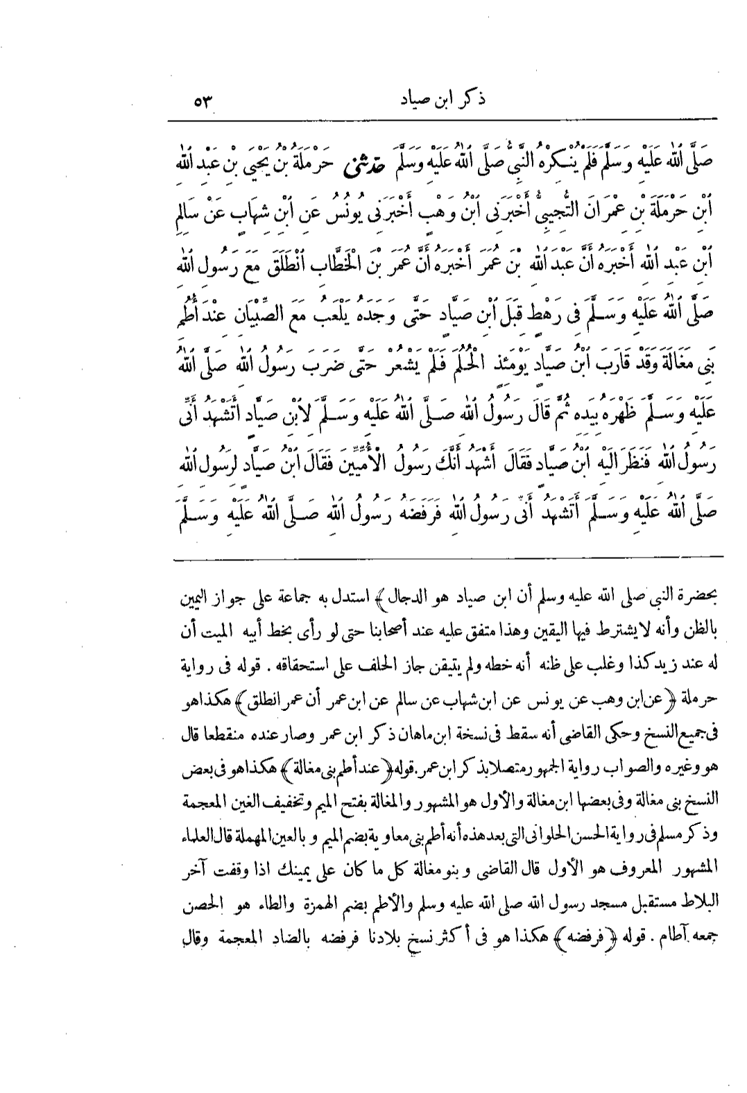 [2930] قوله فى رواية حرملة (عن بن وهب عن يونس عن بن شهاب عن سالم عن بن عُمَرَ أَنَّ عُمَرَ انْطَلَقَ) هَكَذَا هُوَ فِي جَمِيعِ النُّسَخِ وَحَكَى الْقَاضِي أَنَّهُ سَقَطَ فِي نسخة بن ماهان ذكر بن عمر وصار عنده منقطعا قال هو غيره والصواب رواية الجمهور متصلا بذكر بن عُمَرَ قَوْلُهُ (عِنْدَ أُطُمِ بَنِي مَغَالَةَ) هَكَذَا هُوَ فِي بَعْضِ النُّسَخِ بَنِي مَغَالَةَ وَفِي بعضها بن مَغَالَةَ وَالْأَوَّلُ هُوَ الْمَشْهُورُ وَالْمَغَالَةُ بِفَتْحِ الْمِيمِ وَتَخْفِيفِ الْغَيْنِ الْمُعْجَمَةِ وَذَكَرَ مُسْلِمٌ فِي رِوَايَةِ الْحَسَنِ الْحَلْوَانِيِّ الَّتِي بَعْدَ هَذِهِ أَنَّهُ أُطُمُ بَنِي مُعَاوِيَةَ بِضَمِّ الْمِيمِ وَبِالْعَيْنِ الْمُهْمَلَةِ قَالَ الْعُلَمَاءُ الْمَشْهُورُ الْمَعْرُوفُ هُوَ الْأَوَّلُ قَالَ الْقَاضِي وَبَنُو مَغَالَةَ كُلُّ مَا كَانَ عَلَى يَمِينِكِ إِذَا وَقَفْتَ آخِرَ الْبَلَاطِ مُسْتَقْبِلٌ مَسْجِدِ رَسُولِ اللَّهِ صَلَّى اللَّهُ عَلَيْهِ وَسَلَّمَ وَالْأُطُمُ بِضَمِّ الْهَمْزَةِ وَالطَّاءِ هُوَ الْحِصْنُ جَمْعُهُ آطَامٌ قَوْلُهُ (فَرَفَضَهُ) هَكَذَا هُوَ فِي أَكْثَرِ نُسَخِ بِلَادِنَا فَرَفَضَهُ بِالضَّادِ الْمُعْجَمَةِ وَقَالَ