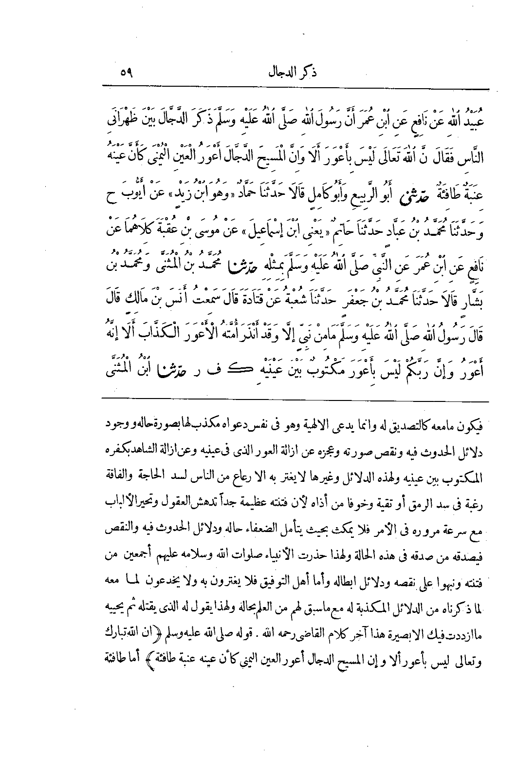 فَيَكُونَ مَا مَعَهُ كَالتَّصْدِيقِ لَهُ وَإِنَّمَا يَدَّعِي الْإِلَهِيَّةَ وَهُوَ فِي نَفْسِ دَعْوَاهُ مُكَذِّبٌ لَهَا بِصُورَةِ حَالِهِ وَوُجُودِ دَلَائِلِ الْحُدُوثِ فِيهِ وَنَقْصِ صُورَتِهِ وَعَجْزِهِ عَنْ إِزَالَةِ الْعَوَرِ الَّذِي فِي عَيْنَيْهِ وَعَنْ إِزَالَةِ الشَّاهِدِ بِكُفْرِهِ الْمَكْتُوبِ بَيْنَ عينيه ولهذه الدلائل وغيرها لايغتر به الارعاع مِنَ النَّاسِ لِسَدِّ الْحَاجَةِ وَالْفَاقَةِ رَغْبَةً فِي سَدِّ الرَّمَقِ أَوْ تَقِيَّةً وَخَوْفًا مِنْ أَذَاهُ لِأَنَّ فِتْنَتَهُ عَظِيمَةٌ جِدًّا تَدْهَشُ الْعُقُولَ وَتُحَيِّرُ الألباب مع سرعة مروره فى الأمر فلايمكث بِحَيْثُ يَتَأَمَّلُ الضُّعَفَاءُ حَالَهُ وَدَلَائِلَ الْحُدُوثِ فِيهِ وَالنَّقْصِ فَيُصَدِّقُهُ مَنْ صَدَّقَهُ فِي هَذِهِ الْحَالَةِ وَلِهَذَا حَذَّرَتِ الْأَنْبِيَاءُ صَلَوَاتُ اللَّهِ وَسَلَامُهُ عَلَيْهِمْ أَجْمَعِينَ مِنْ فِتْنَتِهِ وَنَبَّهُوا عَلَى نَقْصِهِ وَدَلَائِلِ إِبْطَالِهِ وَأَمَّا أَهْلُ التَّوْفِيقِ فَلَا يَغْتَرُّونَ بِهِ ولايخدعون لِمَا مَعَهُ لِمَا ذَكَرْنَاهُ مِنَ الدَّلَائِلِ الْمُكَذِّبَةِ لَهُ مَعَ مَا سَبَقَ لَهُمْ مِنَ الْعِلْمِ بِحَالَهِ وَلِهَذَا يَقُولُ لَهُ الَّذِي يَقْتُلُهُ ثُمَّ يحييه ما ازددت فيك الابصيرة هَذَا آخِرُ كَلَامِ الْقَاضِي رَحِمَهُ اللَّهُ