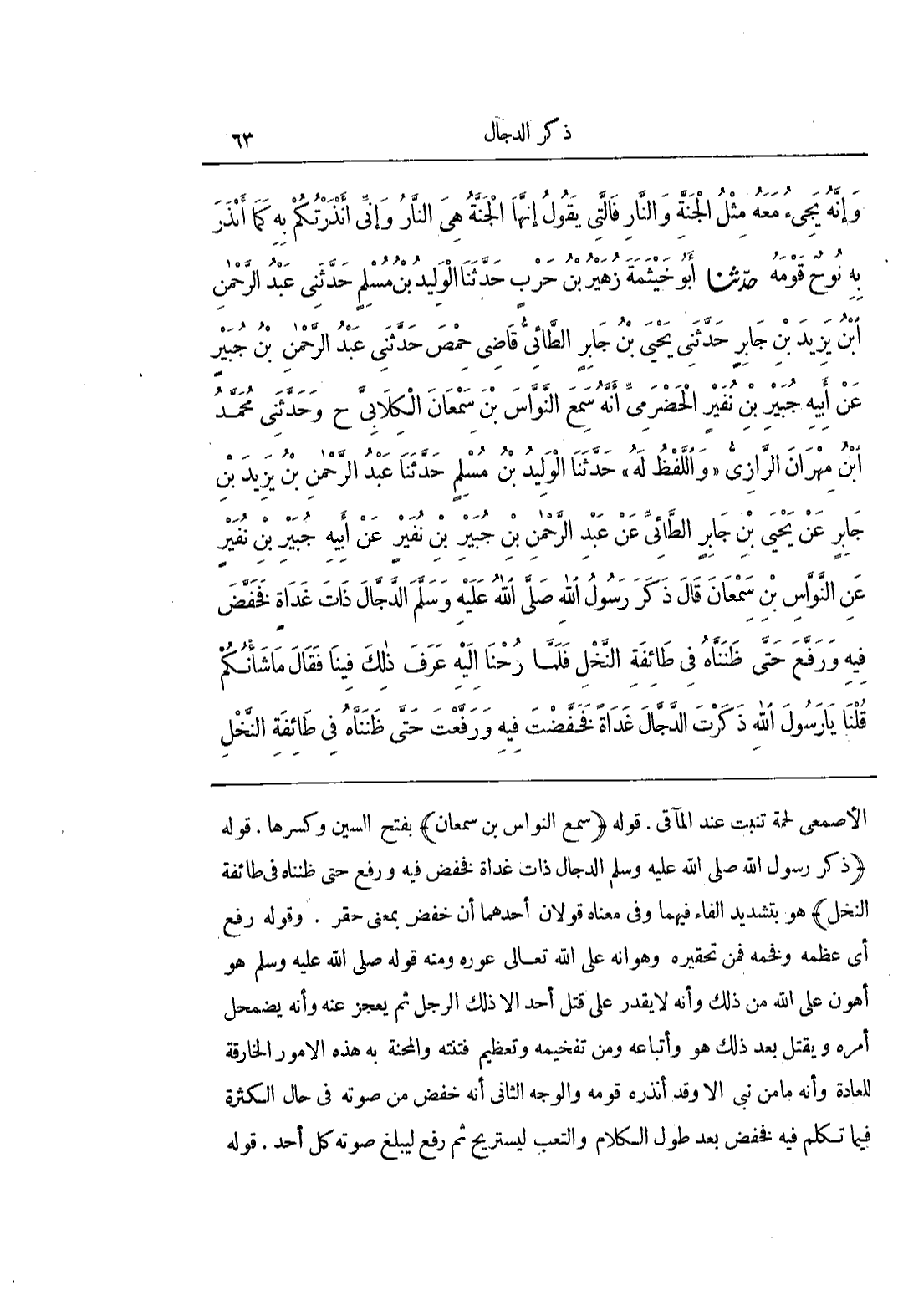 [2937] قَوْلُهُ (سَمِعَ النواس بن سمعان) بفتح السين وكسرها قَوْلُهُ (ذَكَرَ رَسُولُ اللَّهِ صَلَّى اللَّهُ عَلَيْهِ وَسَلَّمَ الدَّجَّالَ ذَاتَ غَدَاةٍ فَخَفَّضَ فِيهِ وَرَفَّعَ حَتَّى ظَنَنَّاهُ فِي طَائِفَةِ النَّخْلِ) هُوَ بِتَشْدِيدِ الْفَاءِ فِيهِمَا وَفِي مَعْنَاهُ قَوْلَانِ أَحَدُهُمَا أَنَّ خَفَّضَ بِمَعْنَى حَقَّرَ وَقَوْلُهُ رَفَّعَ أَيْ عَظَّمَهُ وَفَخَّمَهُ فَمِنْ تَحْقِيرِهِ وَهُوَ أَنَّهُ عَلَى اللَّهِ تَعَالَى عَوَرُهُ وَمِنْهُ قَوْلُهُ صَلَّى اللَّهُ عَلَيْهِ وَسَلَّمَ هُوَ أَهْوَنُ عَلَى اللَّهِ مِنْ ذَلِكَ وَأَنَّهُ لايقدر عَلَى قَتْلِ أَحَدٍ إِلَّا ذَلِكَ الرَّجُلُ ثُمَّ يَعْجِزُ عَنْهُ وَأَنَّهُ يَضْمَحِلُّ أَمْرُهُ وَيُقْتَلُ بَعْدَ ذَلِكَ هُوَ وَأَتْبَاعُهُ وَمِنْ تَفْخِيمِهِ وَتَعْظِيمِ فِتْنَتِهِ وَالْمِحْنَةِ بِهِ هَذِهِ الْأُمُورِ الْخَارِقَةِ لِلْعَادَةِ وَأَنَّهُ ما من نبى الاوقد أَنْذَرَهُ قَوْمَهُ وَالْوَجْهُ الثَّانِي أَنَّهُ خَفَّضَ مِنْ صَوْتِهِ فِي حَالِ الْكَثْرَةِ فِيمَا تَكَلَّمَ فِيهِ فَخَفَّضَ بَعْدَ طُولِ الْكَلَامِ وَالتَّعَبِ لِيَسْتَرِيحَ ثُمَّ رَفَعَ لِيَبْلُغَ صَوْتُهُ كُلَّ أَحَدٍ قَوْلُهُ