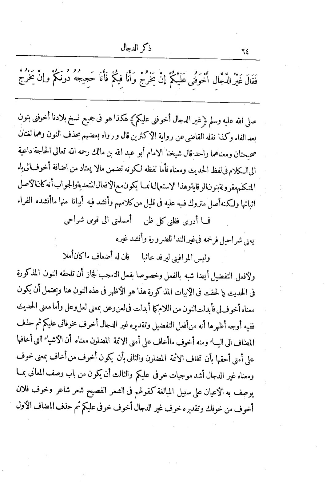 صَلَّى اللَّهُ عَلَيْهِ وَسَلَّمَ (غَيْرُ الدَّجَّالِ أَخْوَفُنِي عَلَيْكُمْ) هَكَذَا هُوَ فِي جَمِيعِ نُسَخِ بِلَادِنَا أَخْوَفُنِي بِنُونٍ بَعْدَ الْفَاءِ وَكَذَا نَقَلَهُ الْقَاضِي عَنْ رِوَايَةِ الْأَكْثَرِينَ قَالَ وَرَوَاهُ بَعْضُهُمْ بِحَذْفِ النُّونِ وَهُمَا لُغَتَانِ صَحِيحَتَانِ وَمَعْنَاهُمَا وَاحِدٌ قَالَ شَيْخُنَا الْإِمَامُ أَبُو عَبْدِ اللَّهِ بْنُ مَالِكٍ رَحِمَهُ اللَّهُ تَعَالَى الْحَاجَةُ دَاعِيَةٌ إِلَى الْكَلَامِ فِي لَفْظِ الْحَدِيثِ وَمَعْنَاهُ فَأَمَّا لَفْظُهُ لِكَوْنِهِ تَضَمَّنَ مَا لَا يُعْتَادُ مِنْ إِضَافَةِ أَخْوَفِ إِلَى يَاءِ الْمُتَكَلِّمِ مَقْرُونَةٌ بِنُونِ الْوِقَايَةِ وَهَذَا الِاسْتِعْمَالُ إِنَّمَا يَكُونُ مَعَ الْأَفْعَالِ الْمُتَعَدِّيَةِ وَالْجَوَابُ أَنَّهُ كَانَ الْأَصْلُ إِثْبَاتَهَا وَلَكِنَّهُ أَصْلٌ مَتْرُوكٌ فَنَبَّهَ عَلَيْهِ فِي قَلِيلٍ مِنْ كَلَامِهِمْ وَأَنْشَدَ فِيهِ أَبْيَاتًا مِنْهَا مَا أَنْشَدَهُ الْفَرَّاءُ ... فَمَا أَدْرِي فَظَنِّي كُلُّ ظَنٍّ ... أَمُسْلِمَتِي إِلَى قَوْمِي شَرَاحِي ...