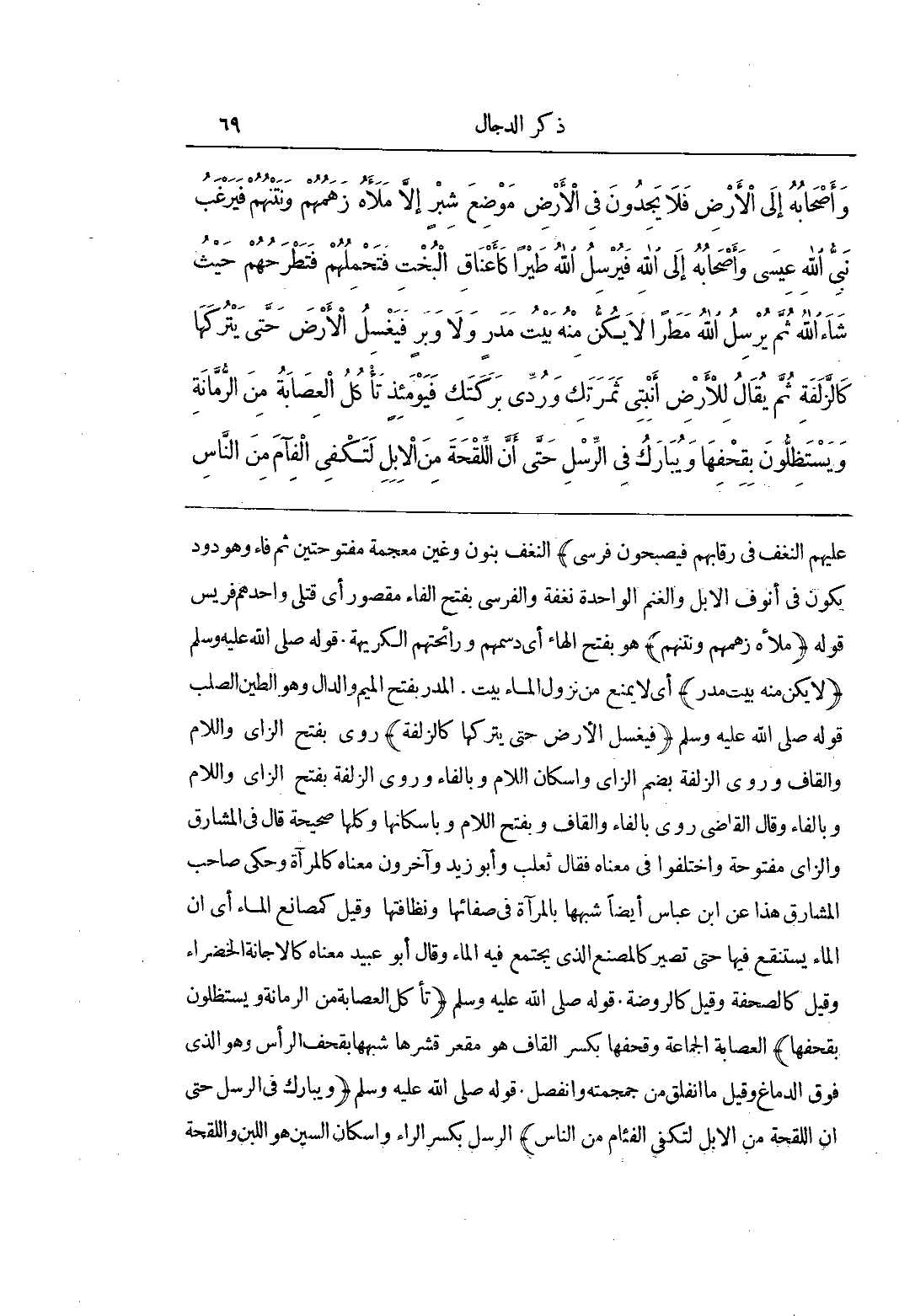 عَلَيْهِمُ النَّغَفَ فِي رِقَابِهِمْ فَيُصْبِحُونَ فَرْسَى) النَّغَفُ بِنُونٍ وَغَيْنٍ مُعْجَمَةٍ مَفْتُوحَتَيْنِ ثُمَّ فَاءٍ وَهُوَ دُودٌ يَكُونُ فِي أُنُوفِ الْإِبِلِ وَالْغَنَمِ الْوَاحِدَةُ نغفة والفرسى بِفَتْحِ الْفَاءِ مَقْصُورٌ أَيْ قَتْلَى وَاحِدُهُمْ فَرِيسٌ قوله (مَلَأَهُ زَهْمُهُمْ وَنَتْنُهُمْ) هُوَ بِفَتْحِ الْهَاءِ أَيْ دَسْمُهُمْ وَرَائِحَتُهُمُ الْكَرِيهَةُ قَوْلُهُ صَلَّى اللَّهُ عَلَيْهِ وسلم (لايكن منه بيت مدر) أى لايمنع مِنْ نُزُولِ الْمَاءِ بَيْتٌ الْمَدَرُ بِفَتْحِ الْمِيمِ وَالدَّالِ وَهُوَ الطِّينُ الصُّلْبُ قَوْلُهُ صَلَّى اللَّهُ عَلَيْهِ وَسَلَّمَ (فَيَغْسِلُ الْأَرْضَ حَتَّى يَتْرُكَهَا كَالزَّلَفَةِ) رُوِيَ بِفَتْحِ الزَّايِ وَاللَّامِ وَالْقَافِ وَرُوِيَ الزُّلْفَةُ بضم الزاى وَإِسْكَانِ اللَّامِ وَبِالْفَاءِ وَرُوِيَ الزَّلَفَةُ بِفَتْحِ الزَّايِ وَاللَّامِ وَبِالْفَاءِ وَقَالَ الْقَاضِي رُوِيَ بِالْفَاءِ وَالْقَافِ وَبِفَتْحِ اللَّامِ وَبِإِسْكَانِهَا وَكُلُّهَا صَحِيحَةٌ قَالَ فِي الْمَشَارِقِ وَالزَّايُ مَفْتُوحَةٌ وَاخْتَلَفُوا فِي مَعْنَاهُ فَقَالَ ثَعْلَبٌ وَأَبُو زَيْدٍ وَآخَرُونَ مَعْنَاهُ كَالْمِرْآةِ وَحَكَى صاحب المشارق هذا عن بن عَبَّاسٍ أَيْضًا شَبَّهَهَا بِالْمِرْآةِ فِي صَفَائِهَا وَنَظَافَتِهَا وَقِيلَ كَمَصَانِعِ الْمَاءِ أَيْ إِنَّ الْمَاءَ يُسْتَنْقَعُ فِيهَا حَتَّى تَصِيرَ كَالْمَصْنَعِ الَّذِي يَجْتَمِعُ فِيهِ الْمَاءُ وَقَالَ أَبُو عُبَيْدٍ مَعْنَاهُ كَالْإِجَّانَةِ الْخَضْرَاءِ وَقِيلَ كَالصَّحْفَةِ وَقِيلَ كَالرَّوْضَةِ قَوْلُهُ صَلَّى اللَّهُ عَلَيْهِ وَسَلَّمَ (تَأْكُلُ الْعِصَابَةُ مِنَ الرُّمَّانَةِ وَيَسْتَظِلُّونَ بقحفها) العصابة الجماعة وقحفها بِكَسْرِ الْقَافِ هُوَ مُقَعَّرُ قِشْرِهَا شَبَّهَهَا بِقِحْفِ الرَّأْسِ وَهُوَ الَّذِي فَوْقَ الدِّمَاغِ وَقِيلَ مَا انْفَلَقَ مِنْ جُمْجُمَتِهِ وَانْفَصَلَ قَوْلُهُ صَلَّى اللَّهُ عَلَيْهِ وَسَلَّمَ (وَيُبَارِكُ فِي الرِّسْلِ حَتَّى إِنَّ اللِّقْحَةَ مِنَ الْإِبِلِ لَتَكْفِي الْفِئَامَ مِنَ النَّاسِ) الرِّسْلُ بِكَسْرِ الرَّاءِ وَإِسْكَانِ السِّينِ هُوَ اللَّبَنُ واللقحة