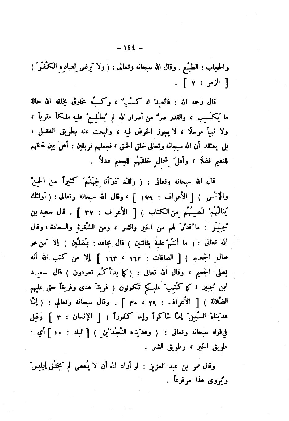 قَالَ اللَّهُ سُبْحَانَهُ وَتَعَالَى: {وَلَقَدْ ذَرَأْنَا لِجَهَنَّمَ كَثِيرًا مِنَ الْجِنِّ وَالإِنْسِ} [الْأَعْرَاف: 179]، وَقَالَ اللَّهُ سُبْحَانَهُ وَتَعَالَى: {أُولَئِكَ يَنَالُهُمْ نَصِيبُهُمْ مِنَ الْكِتَابِ} [الْأَعْرَاف: 37]، قَالَ سَعِيدُ بْنُ جُبَيْرٍ: مَا قُدِّرَ لَهُمْ مِنَ الْخَيْرِ وَالشَّرِّ، وَمِنَ الشِّقْوَةِ وَالسَّعَادَةِ.