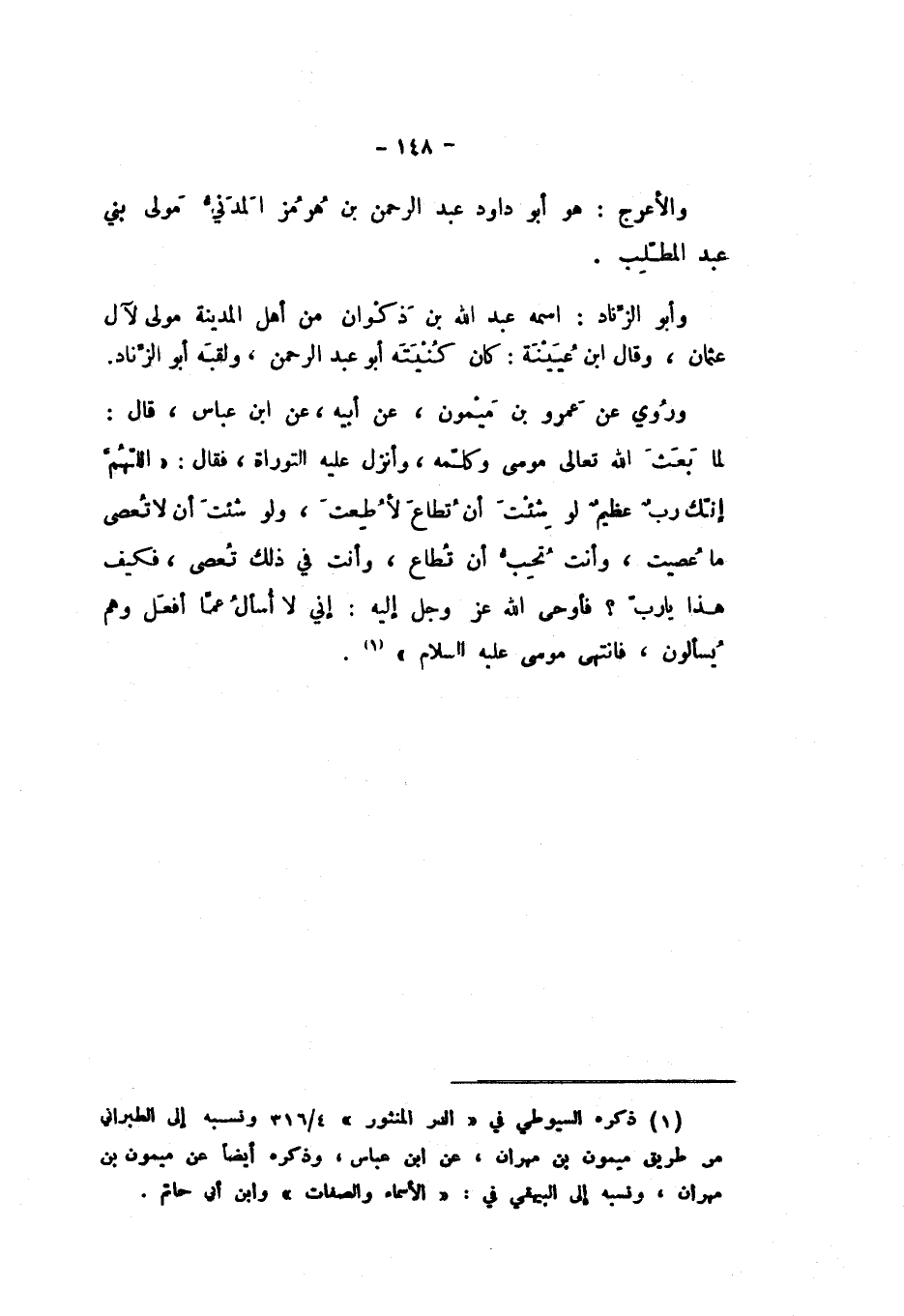 وَرُوِيَ عَنْ عَمْرِو بْنِ مَيْمُونٍ، عَنْ أَبِيهِ، عَنِ ابْنِ عَبَّاسٍ، قَالَ: لَمَّا بَعَثَ اللَّهُ سُبْحَانَهُ وَتَعَالَى مُوسَى وَكَلَّمَهُ، وَأَنْزَلَ عَلَيْهِ التَّوْرَاةَ، فَقَالَ: " اللَّهُمَّ إِنَّكَ رَبٌّ عَظِيمٌ، لَوْ شِئْتَ أَنْ تُطَاعَ لأُطِعْتَ، وَلَوْ شِئْتَ أَنْ لَا تُعْصَى مَا عُصِيتَ، وَأَنْتَ تُحِبُّ أَنْ تُطَاعَ، وَأَنْتَ فِي ذَلِكَ تُعْصَى، فَكَيْفَ هَذَا يَا رَبِّ؟ فَأَوْحَى اللَّهُ عَزَّ وَجَلَّ إِلَيْهِ: «إِنِّي لَا أُسْأَلُ عَمَّا أَفْعَلُ، وَهُمْ يُسْأَلُونَ، فَانْتَهَى مُوسَى عَلَيْهِ السَّلامُ».