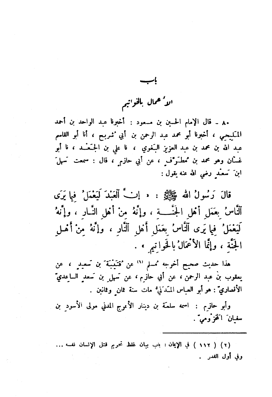 80 - قَالَ الإِمَامُ الْحُسَيْنُ بْنُ مَسْعُودٍ: أَخْبَرَنَا عَبْدُ الْوَاحِدِ بْنُ أَحْمَدَ الْمَلِيحِيُّ، أَخْبَرَنَا أَبُو مُحَمَّدٍ عَبْدُ الرَّحْمَنِ بْنُ أَبِي شُرَيْحٍ، أَنا أَبُو الْقَاسِمِ عَبْدُ اللَّهِ بْنُ مُحَمَّدِ بْنِ عَبْدِ الْعَزِيزِ الْبَغَوِيُّ، نَا عَلِيُّ بْنُ الْجَعْدِ، نَا أَبُو غَسَّانَ وَهُوَ مُحَمَّدُ بْنُ مُطَرِّفٍ، عَنْ أَبِي حَازِمٍ، قَالَ: سَمِعْتُ سَهْلَ بْنَ سَعْدٍ رَضِيَ اللَّهُ عَنْهُ، يَقُولُ، قَالَ رَسُولُ اللَّهِ صَلَّى اللهُ عَلَيْهِ وَسَلَّمَ: «إِنَّ الْعَبْدَ لَيَعْمَلُ فِيمَا يَرَى النَّاسُ بِعَمَلِ أَهْلِ الْجَنَّةِ، وَإِنَّهُ مِنْ أَهْلِ النَّارِ، وَإِنَّهُ لَيَعْمَلُ فِيمَا يَرَى النَّاسُ بِعَمَلِ أَهْلِ النَّارِ، وَإِنَّهُ مِنْ أَهْلِ الْجَنَّةِ، وَإِنَّمَا الأَعْمَالُ بِالْخَوَاتِيمِ» هَذَا حَدِيثٌ صَحِيحٌ، أَخْرَجَهُ مُسْلِمٌ، عَنْ قُتَيْبَةَ بْنِ سَعِيدٍ، عَنْ يَعْقُوبَ بْنِ عَبْدِ الرَّحْمَنِ، عَنْ أَبِي حَازِمٍ، عَنْ سَهْلِ بْنِ سَعْدٍ السَّاعِدِيِّ الأَنْصَارِيِّ