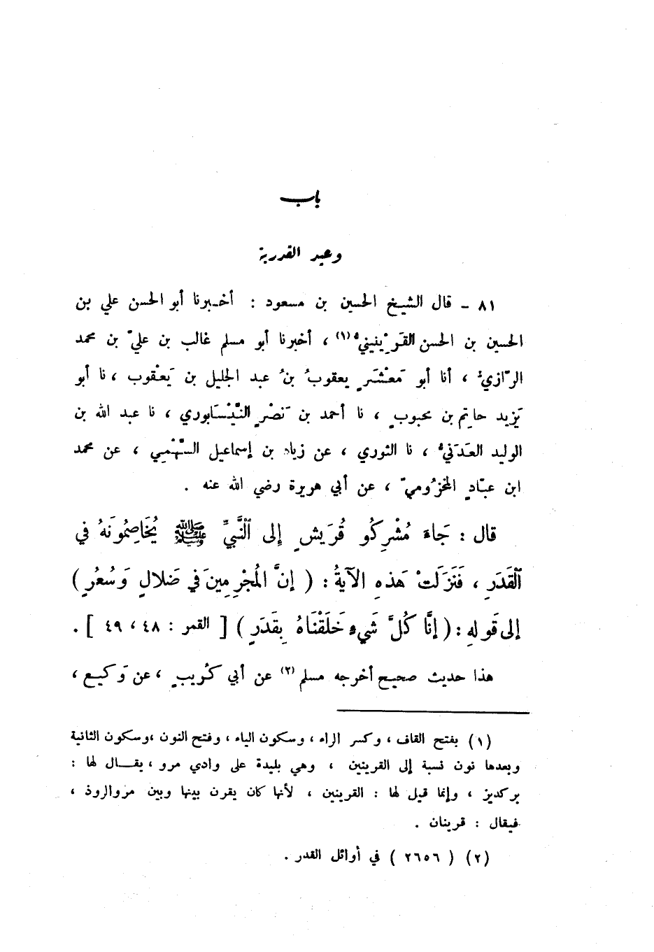 81 - قَالَ الشَّيْخُ الْحُسَيْنُ بْنُ مَسْعُودٍ: أَخْبَرَنَا أَبُو الْحَسَنِ عَلِيُّ بْنُ الْحُسَيْنِ بْنِ الْحَسَنِ الْقَرِينَيْنِيُّ، أَخْبَرَنَا أَبُو مُسْلِمٍ غَالِبُ بْنُ عَلِيِّ بْنِ مُحَمَّدٍ الرَّازِيُّ، أَنا أَبُو مَعْشَرٍ يَعْقُوبُ بْنُ عَبْدِ الْجَلِيلِ بْنِ يَعْقُوبَ، نَا أَبُو يَزِيدَ حَاتِمُ بْنُ مَحْبُوبٍ، نَا أَحْمَدُ بْنُ نَصْرٍ النَّيْسَابُورِيُّ، نَا عَبْدُ اللَّهِ بْنُ الْوَلِيدِ الْعَدَنِيُّ، نَا الثَّوْرِيُّ، عَنْ زِيَادِ بْنِ إِسْمَاعِيلَ السَّهْمِيِّ، عَنْ مُحَمَّدِ بْنِ عَبَّادٍ الْمَخْزُومِيِّ، عَنْ أَبِي هُرَيْرَةَ رَضِيَ اللَّهُ عَنْهُمْ، قَالَ: " جَاءَتْ مُشْرِكُو قُرَيْشٍ إِلَى النَّبِيِّ صَلَّى اللهُ عَلَيْهِ وَسَلَّمَ يُخَاصِمُونَهُ فِي الْقَدَرِ، فَنَزَلَتْ هَذِهِ الآيَةُ: {إِنَّ الْمُجْرِمِينَ فِي ضَلالٍ وَسُعُرٍ} [الْقَمَر: 47]، إِلَى قَوْلِهِ: {إِنَّا كُلَّ شَيْءٍ خَلَقْنَاهُ بِقَدَرٍ} [الْقَمَر: 49] ".