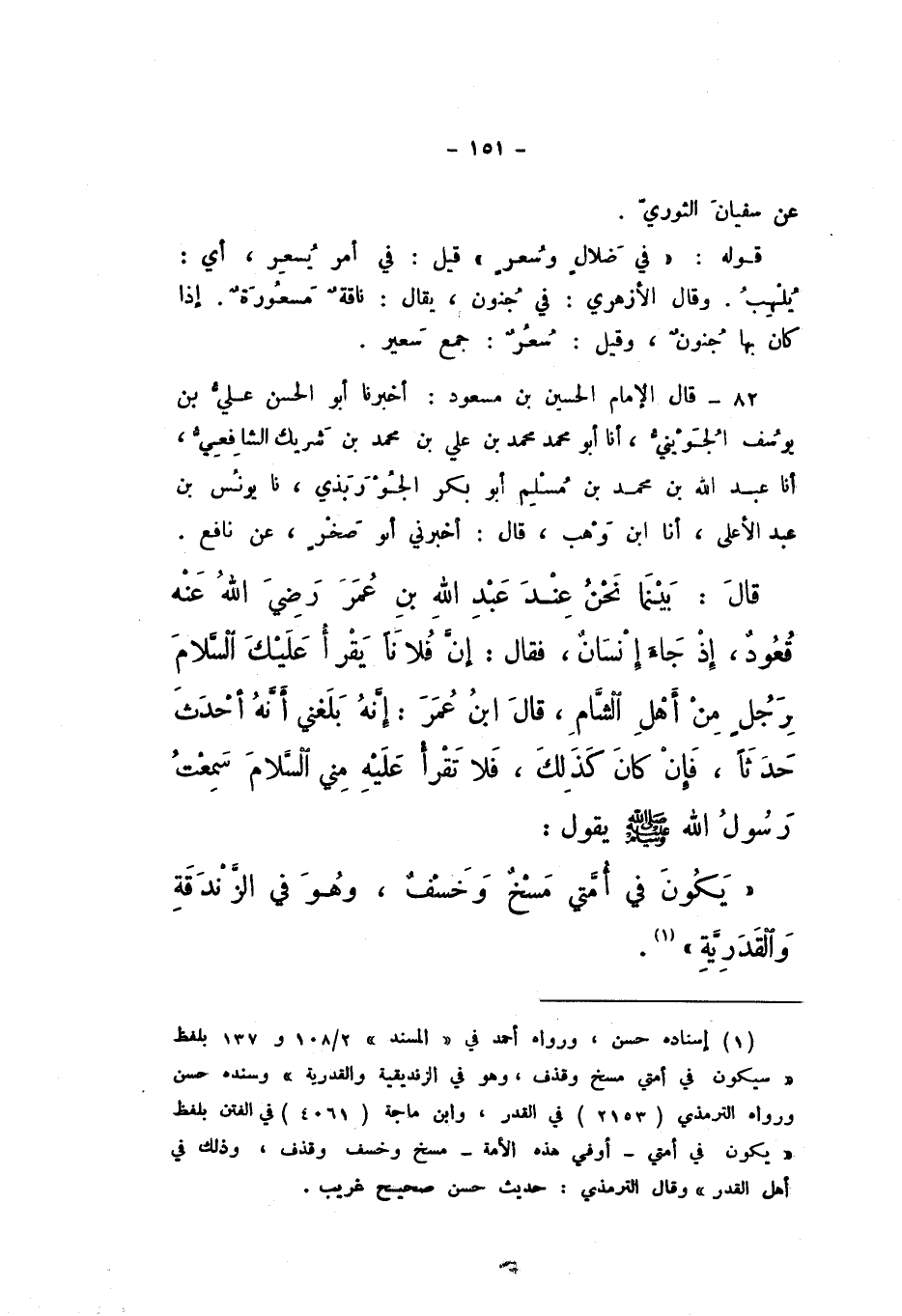 82 - قَالَ الإِمَامُ الْحُسَيْنُ بْنُ مَسْعُودٍ: أَخْبَرَنَا أَبُو الْحَسَنِ عَلِيُّ بْنُ يُوسُفَ الْجُوَيْنِيُّ، أَنا أَبُو مُحَمَّدٍ مُحَمَّدُ بْنُ عَلِيِّ بْنِ مُحَمَّدِ بْنِ شَرِيكٍ الشَّافِعِيُّ، أَنا عَبْدُ اللَّهِ بْنُ مُحَمَّدِ بْنِ مُسْلِمٍ أَبُو بَكْرٍ الْجُورَبَذِيُّ، نَا يُونُسُ بْنُ عَبْدِ الأَعْلَى، أَنا ابْنُ وَهْبٍ، قَالَ: أَخْبَرَنِي أَبُو صَخْرٍ، عَنْ نَافِعٍ، قَالَ: بَيْنَمَا نَحْنُ عِنْدَ عَبْدِ اللَّهِ بْنِ عُمَرَ رَضِيَ اللَّهُ عَنْهُ قُعُودٌ، إِذْ جَاءَهُ إِنْسَانٌ، فَقَالَ: إِنَّ فُلانًا يَقْرَأُ عَلَيْكَ السَّلامَ، لِرَجُلٍ مِنْ أَهْلِ الشَّامِ، قَالَ ابْنُ عُمَرَ: إِنَّهُ بَلَغَنِي أَنَّهُ قَدْ أَحْدَثَ حَدَثًا، فَإِنْ كَانَ كَذَلِكَ، فَلا تَقْرَأْ عَلَيْهِ مِنِّي السَّلامَ، سَمِعْتُ رَسُولَ اللَّهِ صَلَّى اللهُ عَلَيْهِ وَسَلَّمَ، يَقُولُ: «يَكُونَ فِي أُمَّتِي مَسْخٌ وَخَسْفٌ، وَهُوَ فِي الزَّنْدَقَةِ وَالْقَدَرِيَّةِ»،