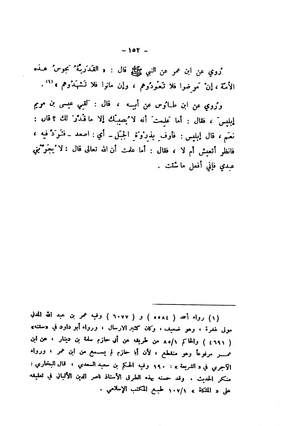 وَرُوِيَ عَنِ ابْنِ عُمَرَ، عَنِ النَّبِيِّ صَلَّى اللهُ عَلَيْهِ وَسَلَّمَ، قَالَ: " الْقَدَرِيَّةُ مَجُوسُ هَذِهِ الأُمَّةِ، إِنْ مَرِضُوا فَلا تَعُودُوهُمْ، وَإِنْ مَاتُوا فَلا تَشْهَدُوهُمْ
