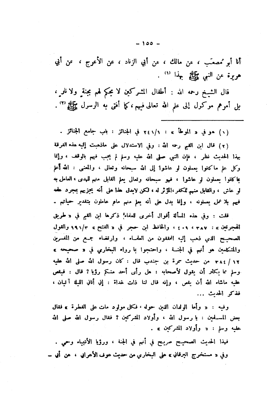 قَالَ الشَّيْخُ، رَحِمَهُ اللَّهُ: أَطْفَالُ الْمُشْرِكِينَ لَا يُحْكَمُ لَهُمْ بِجَنَّةٍ وَلا نَارٍ، بَلْ أَمْرُهُمْ مَوْكُولٌ إِلَى عِلْمِ اللَّهِ تَعَالَى فِيهِمْ، كَمَا أَفْتَى بِهِ الرَّسُولُ صَلَّى اللهُ عَلَيْهِ وَسَلَّمَ.