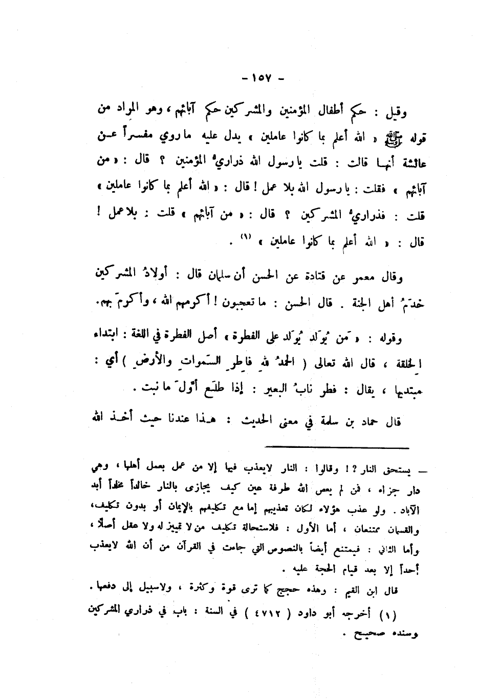وَقِيلَ: حُكْمُ أَطْفَالِ الْمُؤْمِنِينَ وَالْمُشْرِكِينَ حُكْمُ آبَائِهِمْ، وَهُوَ الْمُرَادُ مِنْ قَوْلِهِ صَلَّى اللهُ عَلَيْهِ وَسَلَّمَ: «اللَّهُ أَعْلَمُ بِمَا كَانُوا عَامِلِينَ»، يَدُلُّ عَلَيْهِ مَا رُوِيَ مُفَسَّرًا عَنْ عَائِشَةَ، أَنَّهَا قَالَتْ: قُلْتُ: يَا رَسُولَ اللَّهِ، ذَرَارِيُّ الْمُؤْمِنِينَ؟ قَالَ: «مِنْ آبَائِهِمْ».