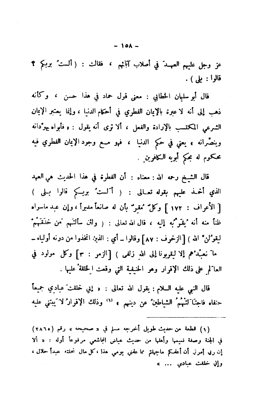 قَالَ الشَّيْخُ رَحِمَهُ اللَّهُ: مَعْنَاهُ: أَنَّ الْفِطْرَةَ فِي هَذَا الْحَدِيثِ هِيَ الْعَهْدُ الَّذِي أُخِذَ عَلَيْهِمْ بِقَوْلِهِ تَعَالَى: {أَلَسْتُ بِرَبِّكُمْ قَالُوا بَلَى} [الْأَعْرَاف: 172]، وَكُلٌّ مُقِرٌّ بِأَنَّ لَهُ صَانِعًا مُدَبِّرًا، وَإِنْ عَبَدَ مَا سِوَاهُ ظَنًّا مِنْهُ أَنَّهُ يُقَرِّبُهُ إِلَيْهِ، قَالَ اللَّهُ تَعَالَى: {وَلَئِنْ سَأَلْتَهُمْ مَنْ خَلَقَهُمْ لَيَقُولُنَّ اللَّهُ} [الزخرف: 87] وَقَالُوا: أَيِ الَّذِينَ اتَّخَذُوا مِنْ دُونِهِ أَوْلِيَاءَ {مَا نَعْبُدُهُمْ إِلا لِيُقَرِّبُونَا إِلَى اللَّهِ زُلْفَى} [الزمر: 3] وَكُلُّ مَوْلُودٍ فِي الْعَالَمِ عَلَى ذَلِكَ الإِقْرَارِ، وَهُوَ الْحَنِيفِيَّةُ الَّتِي وَقَعَتِ الْخِلْقَةُ عَلَيْهَا.