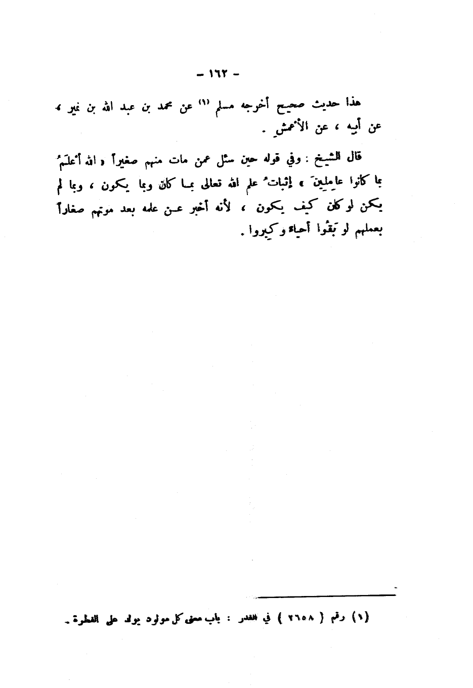 قَالَ الشَّيْخُ: وَفِي قَوْلِهِ حِينَ سُئِلَ عَمَّنْ مَاتَ مِنْهُمْ صَغِيرًا: «اللَّهُ أَعْلَمُ بِمَا كَانُوا عَامِلِينَ» إِثْبَاتُ عِلْمُ اللَّهِ تَعَالَى بِمَا كَانَ، وَبِمَا يَكُونُ، وَبِمَا لَمْ يَكُنْ، لَوْ كَانَ كَيْفَ يَكُونُ، لأَنَّهُ أَخْبَرَ عَنْ عِلْمِهِ بَعْدَ مَوْتِهِمْ صِغَارًا بِعَمَلِهِمْ لَوْ بَقُوا أَحْيَاءً وَكَبُرُوا.