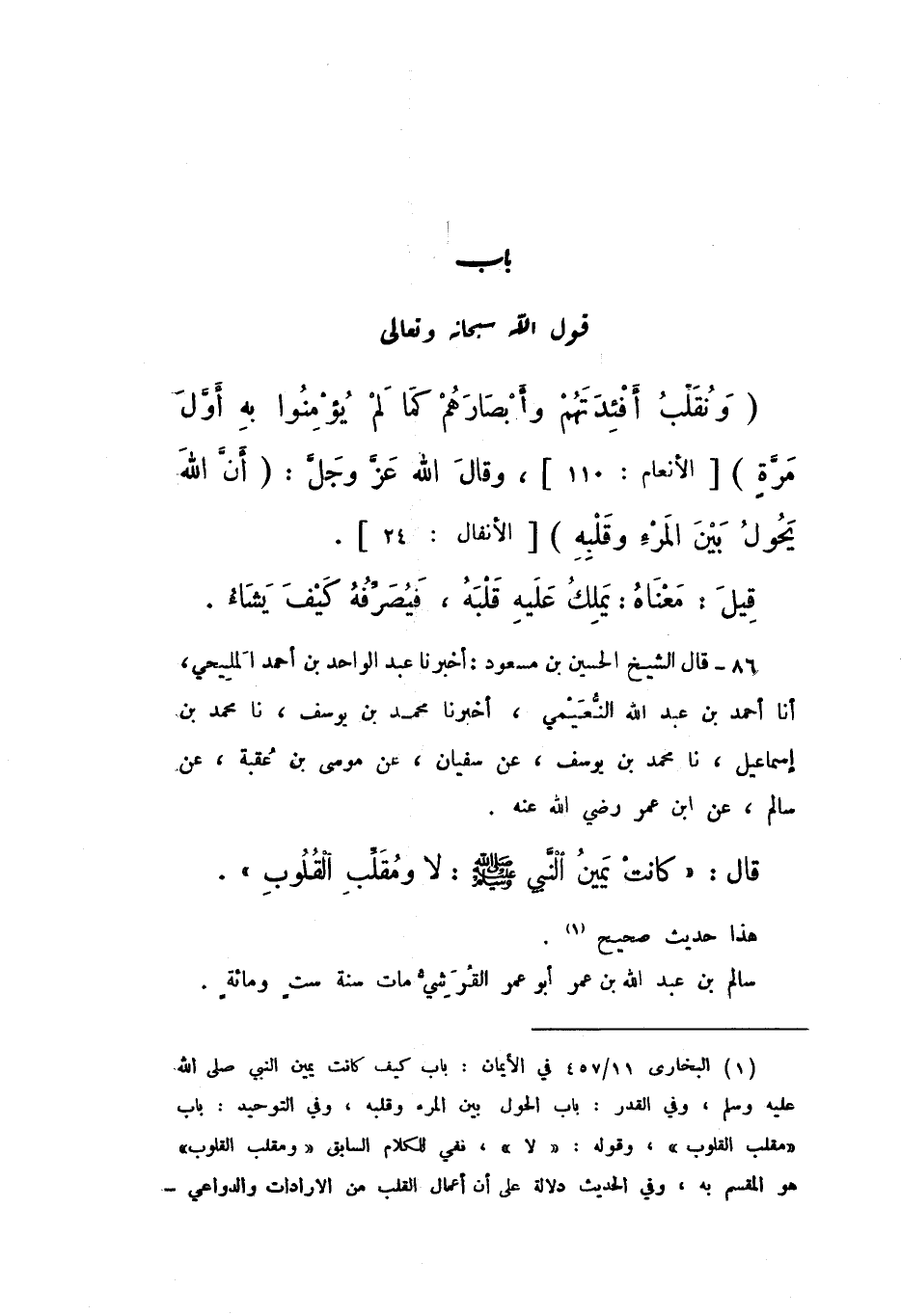 {وَنُقَلِّبُ أَفْئِدَتَهُمْ وَأَبْصَارَهُمْ كَمَا لَمْ يُؤْمِنُوا بِهِ أَوَّلَ مَرَّةٍ} [الْأَنْعَام: 110]، وَقَالَ اللَّهُ عَزَّ وَجَلَّ: {أَنَّ اللَّهَ يَحُولُ بَيْنَ الْمَرْءِ وَقَلْبِهِ} [الْأَنْفَال: 24].