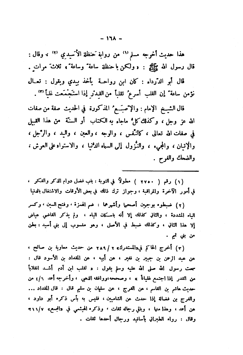 هَذَا حَدِيثٌ أَخْرَجَهُ مُسْلِمٌ، مِنْ رِوَايَةِ حَنْظَلَةَ الأُسَيْدِيِّ، وَقَالَ: قَالَ رَسُولُ اللَّهِ صَلَّى اللهُ عَلَيْهِ وَسَلَّمَ: «وَلَكِنْ يَا حَنْظَلَةُ سَاعَةً وَسَاعَةً»، ثَلاثَ مَرَّاتٍ