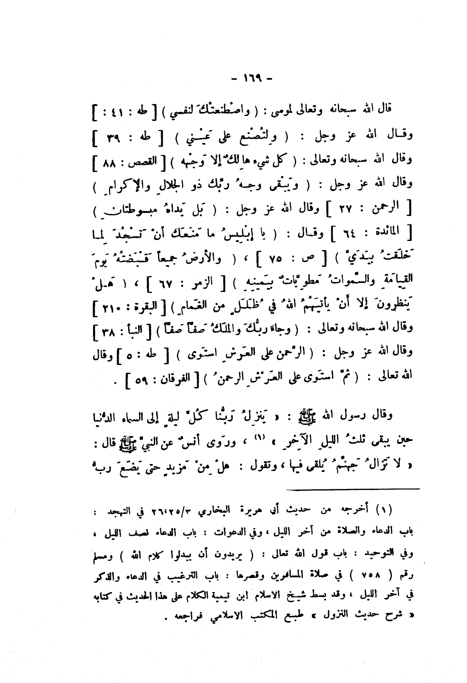 قَالَ اللَّهُ سُبْحَانَهُ وَتَعَالَى لِمُوسَى: {وَاصْطَنَعْتُكَ لِنَفْسِي} [طه: 41]، وَقَالَ اللَّهُ عَزَّ وَجَلَّ: {وَلِتُصْنَعَ عَلَى عَيْنِي} [طه: 39]، وَقَالَ اللَّهُ سُبْحَانَهُ وَتَعَالَى: {كُلُّ شَيْءٍ هَالِكٌ إِلا وَجْهَهُ} [الْقَصَص: 88]، وَقَالَ اللَّهُ عَزَّ وَجَلَّ: {وَيَبْقَى وَجْهُ رَبِّكَ ذُو الْجَلالِ وَالإِكْرَامِ} [الرَّحْمَن: 27]، وَقَالَ اللَّهُ عَزَّ وَجَلَّ: {بَلْ يَدَاهُ مَبْسُوطَتَانِ} [الْمَائِدَة: 64]، وَقَالَ: {يَا إِبْلِيسُ مَا مَنَعَكَ أَنْ تَسْجُدَ لِمَا خَلَقْتُ بِيَدَيَّ} [ص: 75]، {وَالأَرْضُ جَمِيعًا قَبْضَتُهُ يَوْمَ الْقِيَامَةِ وَالسَّمَوَاتُ مَطْوِيَّاتٌ بِيَمِينِهِ} [الزمر: 67]، {هَلْ يَنْظُرُونَ إِلا أَنْ يَأْتِيَهُمُ اللَّهُ فِي ظُلَلٍ مِنَ الْغَمَامِ} [الْبَقَرَة: 210]، وَقَالَ اللَّهُ سُبْحَانَهُ وَتَعَالَى: {وَجَاءَ رَبُّكَ وَالْمَلَكُ صَفًّا صَفًّا} [الْفجْر: 22]، وَقَالَ اللَّهُ عَزَّ وَجَلَّ: {الرَّحْمَنُ عَلَى الْعَرْشِ اسْتَوَى} [طه: 5]، وَقَالَ اللَّهُ تَعَالَى: {ثُمَّ اسْتَوَى عَلَى الْعَرْشِ الرَّحْمَنُ} [الْفرْقَان: 59].