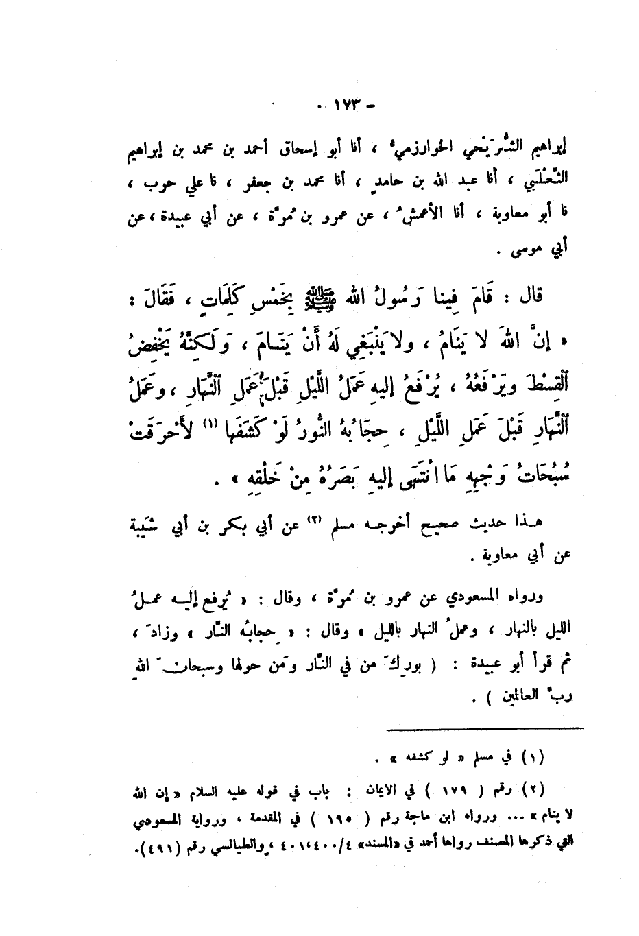 إِبْرَاهِيمَ الشُّرَيْحِيُّ الْخَوَارِزْمِيُّ، أَنا أَبُو إِسْحَاقَ أَحْمَدُ بْنُ مُحَمَّدِ بْنِ إِبْرَاهِيمَ الثَّعْلَبِيُّ، أَنا عَبْدُ اللَّهِ بْنُ حَامِدٍ، أَنا مُحَمَّدُ بْنُ جَعْفَرٍ، نَا عَلِيُّ بْنُ حَرْبٍ، نَا أَبُو مُعَاوِيَةَ، أَنا الأَعْمَشُ، عَنْ عَمْرِو بْنِ مُرَّةَ، عَنْ أَبِي عُبَيْدَةَ، عَنْ أَبِي مُوسَى، قَالَ: قَامَ فِينَا رَسُولُ اللَّهِ صَلَّى اللهُ عَلَيْهِ وَسَلَّمَ بِخَمْسِ كَلِمَاتٍ، فَقَالَ: «إِنَّ اللَّهَ لَا يَنَامُ، وَلا يَنْبَغِي لَهُ أَنْ يَنَامَ، وَلَكِنَّهُ يَخْفِضُ الْقِسْطَ وَيَرْفَعُهُ، يُرْفَعُ إِلَيْهِ عَمَلُ اللَّيْلِ قَبْلَ عَمَلِ النَّهَارِ، وَعَمَلُ النَّهَارِ قَبْلَ عَمَلِ اللَّيْلِ، حِجَابُهُ النُّورُ لَوْ كَشَفَهَا لأَحْرَقَتْ سُبُحَاتُ وَجْهِهِ مَا انْتَهَى إِلَيْهِ بَصَرُهُ مِنْ خَلْقِهِ» هَذَا حَدِيثٌ صَحِيحٌ، أَخْرَجَهُ مُسْلِمٌ، عَنْ أَبِي بَكْرِ بْنِ أَبِي شَيْبَةَ، عَنْ أَبِي مُعَاوِيَةَ، وَرَوَاهُ الْمَسْعُودِيُّ، عَنْ عَمْرِو بْنِ مُرَّةَ، وَقَالَ: «يُرْفَعُ إِلَيْهِ عَمَلُ اللَّيْلِ بِالنَّهَارِ، وَعَمَلُ النَّهَارِ بِاللَّيْلِ»، وَقَالَ: «حِجَابُهُ النَّارُ»، وَزَادَ: ثُمَّ قَرَأَ أَبُو عُبَيْدَةَ: {بُورِكَ مَنْ فِي النَّارِ وَمَنْ حَوْلَهَا وَسُبْحَانَ اللَّهِ رَبِّ الْعَالَمِينَ} [النَّمْل: 8]