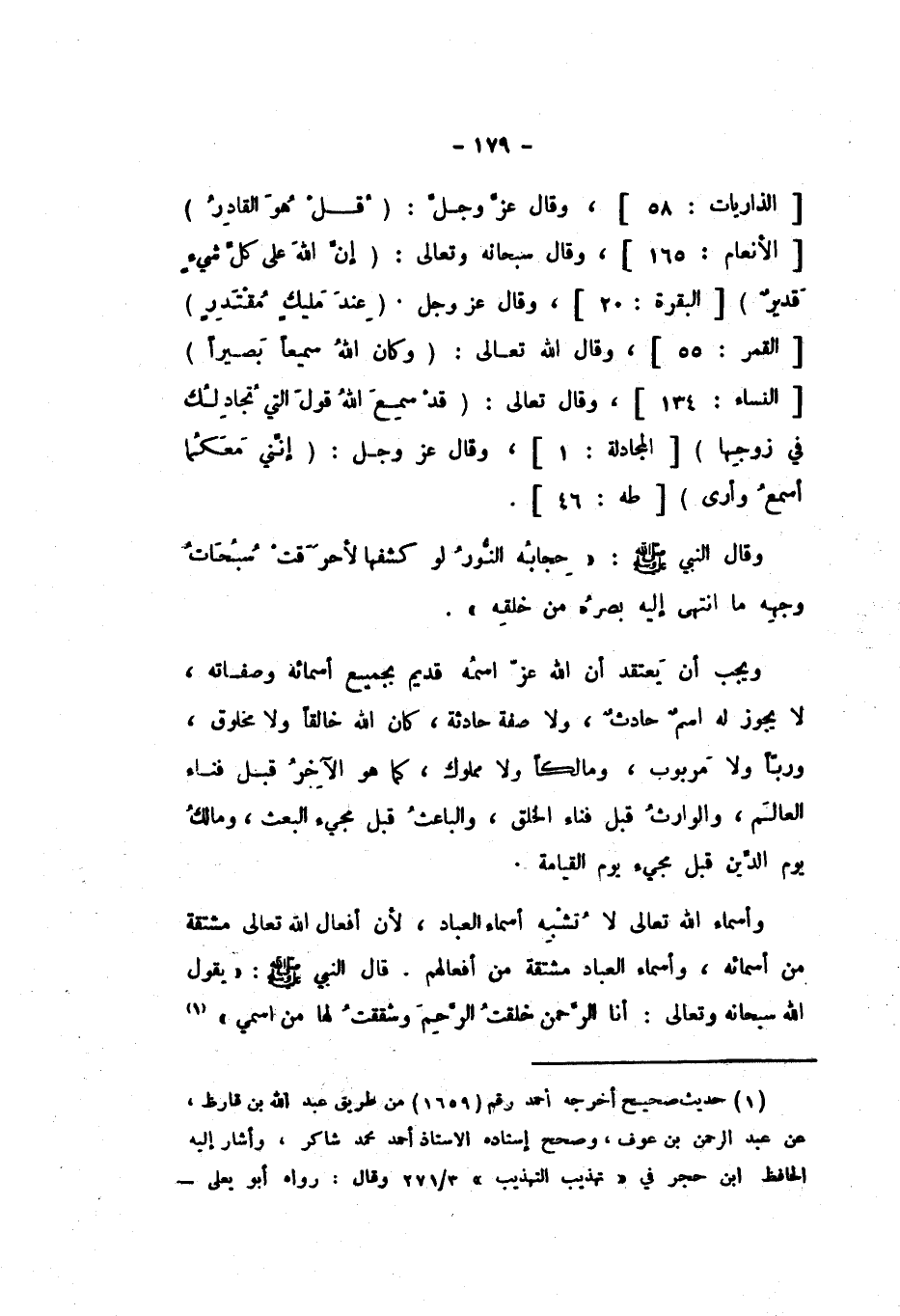 الذاريات: 58]، وَقَالَ عَزَّ وَجَلَّ: {قُلْ هُوَ الْقَادِرُ} [الْأَنْعَام: 65]، وَقَالَ سُبْحَانَهُ وَتَعَالَى: {إِنَّ اللَّهَ عَلَى كُلِّ شَيْءٍ قَدِيرٌ} [الْبَقَرَة: 20]، وَقَالَ عَزَّ وَجَلَّ: {عِنْدَ مَلِيكٍ مُقْتَدِرٍ} [الْقَمَر: 55]، وَقَالَ اللَّهُ تَعَالَى: {وَكَانَ اللَّهُ سَمِيعًا بَصِيرًا} [النِّسَاء: 134]، وَقَالَ تَعَالَى: {قَدْ سَمِعَ اللَّهُ قَوْلَ الَّتِي تُجَادِلُكَ فِي زَوْجِهَا} [المجادلة: 1]، وَقَالَ عَزَّ وَجَلَّ: {إِنَّنِي مَعَكُمَا أَسْمَعُ وَأَرَى} [طه: 46].