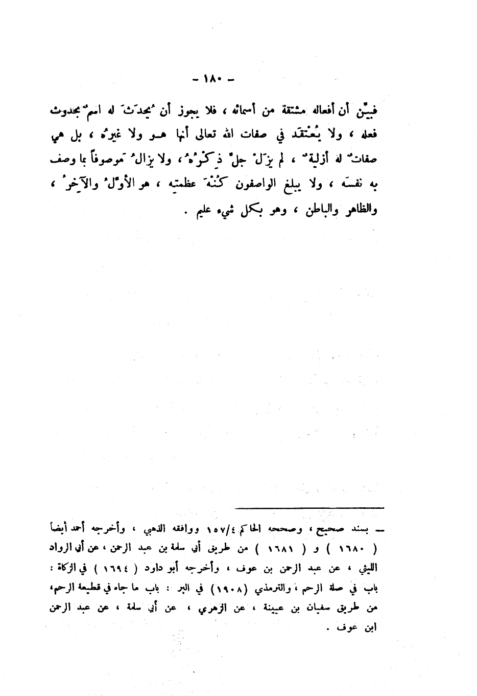 فَبَيَّنَ أَنَّ أَفْعَالَهُ مُشْتَقَّةٌ مِنْ أَسْمَائِهِ، فَلا يَجُوزُ أَنْ يُحْدَثَ لَهُ اسْمٌ بِحُدُوثِ فِعْلِهِ، وَلا يُعْتَقَدُ فِي صِفَاتِ اللَّهِ تَعَالَى أَنَّهَا هُوَ وَلا غَيْرُهُ، بَلْ هِيَ صِفَاتٌ لَهُ أَزَلِيَّةٌ، لَمْ يَزَلْ جَلَّ ذِكْرُهُ، وَلا يَزَالُ مَوْصُوفًا بِمَا وَصَفَ بِهِ نَفْسَهُ، وَلا يَبْلُغُ الْوَاصِفُونَ كُنْهَ عَظَمَتِهِ، هُوَ الأَوَّلُ وَالآخِرُ، وَالظَّاهِرُ وَالْبَاطِنُ، وَهُوَ بِكُلِّ شَيْءٍ عَلِيمٌ.