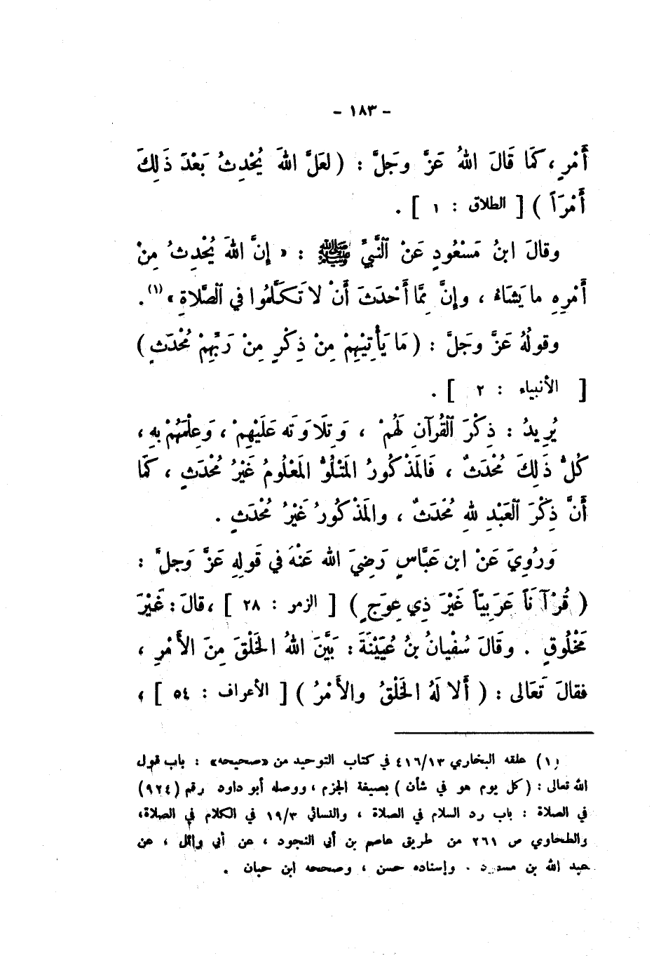 أَمْرٍ، كَمَا قَالَ اللَّهُ عَزَّ وَجَلَّ: {لَعَلَّ اللَّهَ يُحْدِثُ بَعْدَ ذَلِكَ أَمْرًا} [الطَّلَاق: 1]، وَقَالَ ابْنُ مَسْعُودٍ، عَنِ النَّبِيِّ صَلَّى اللهُ عَلَيْهِ وَسَلَّمَ: «إِنَّ اللَّهَ يُحْدِثُ مِنْ أَمْرِهِ مَا يَشَاءُ، وَإِنَّ مِمَّا أَحْدَثَ أَنْ لَا تَكَلَّمُوا فِي الصَّلاةِ».