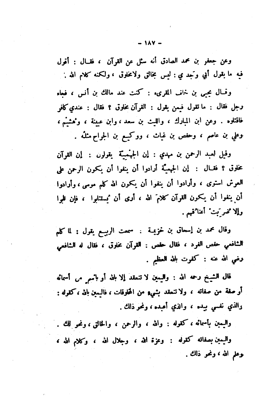 وَعَنْ جَعْفَرِ بْنِ مُحَمَّدٍ الصَّادِقِ، أَنَّهُ سُئِلَ عَنِ الْقُرْآنِ، فَقَالَ: أَقُولُ فِيهِ مَا يَقُولُ أَبِي وَجَدِّي: لَيْسَ بِخَالِقٍ وَلا مَخْلُوقٍ، وَلَكِنَّهُ كَلامُ اللَّهِ.
