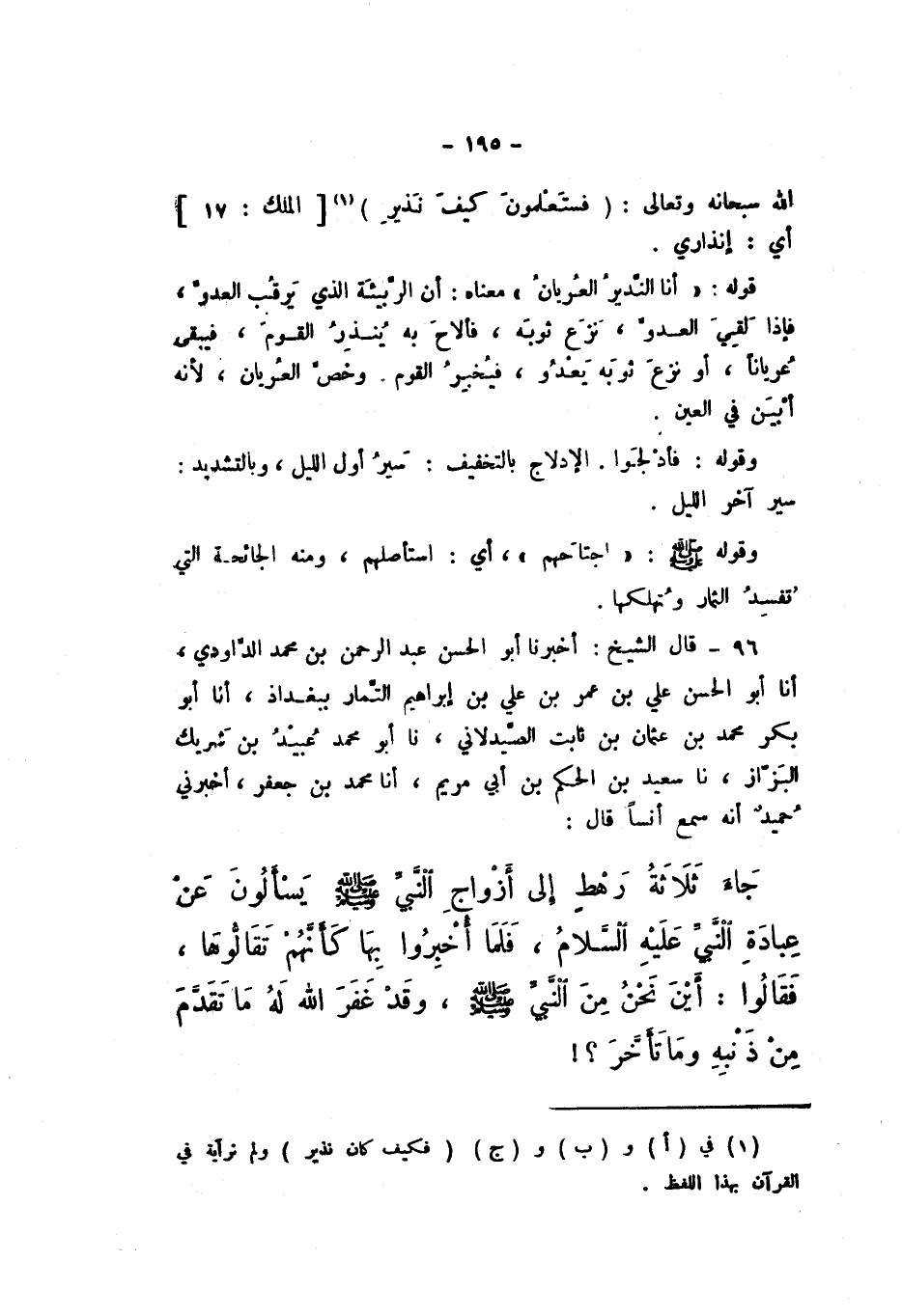 96 - قَالَ الشَّيْخُ الْحُسَيْنُ: أَخْبَرَنَا أَبُو الْحَسَنِ عَبْدُ الرَّحْمَنِ بْنُ مُحَمَّدٍ الدَّاوُدِيُّ، أَنا أَبُو الْحَسَنِ عَلِيُّ بْنُ عُمَرَ بْنِ عَلِيِّ بْنِ إِبْرَاهِيمَ التَّمَّارُ بِبَغْدَادَ، أَنا أَبُو بَكْرٍ مُحَمَّدُ بْنُ عُثْمَانَ بْنِ ثَابِتٍ الصَّيْدَلانِيُّ، نَا أَبُو مُحَمَّدٍ عُبَيْدُ بْنُ شَرِيكٍ الْبَزَّازُ، نَا سَعِيدُ بْنُ الْحَكَمِ بْنِ أَبِي مَرْيَمَ، أَنا مُحَمَّدُ بْنُ جَعْفَرٍ، أَخْبَرَنِي حُمَيْدٌ، أَنَّهُ سَمِعَ أَنَسًا، قَالَ: جَاءَ ثَلاثَةُ رَهْطٍ إِلَى أَزْوَاجِ النَّبِيِّ صَلَّى اللهُ عَلَيْهِ وَسَلَّمَ يَسْأَلُونَ عَنْ عِبَادَةِ النَّبِيِّ صَلَّى اللهُ عَلَيْهِ وَسَلَّمَ، فَلَمَّا أُخْبِرُوا بِهَا كَأَنَّهُمْ تَقَالُّوهَا، فَقَالُوا: " أَيْنَ نَحْنُ مِنَ النَّبِيِّ صَلَّى اللهُ عَلَيْهِ وَسَلَّمَ، وَقَدْ غَفَرَ اللَّهُ لَهُ مَا تَقَدَّمَ مِنْ ذَنْبِهِ وَمَا تَأَخَّرَ؟