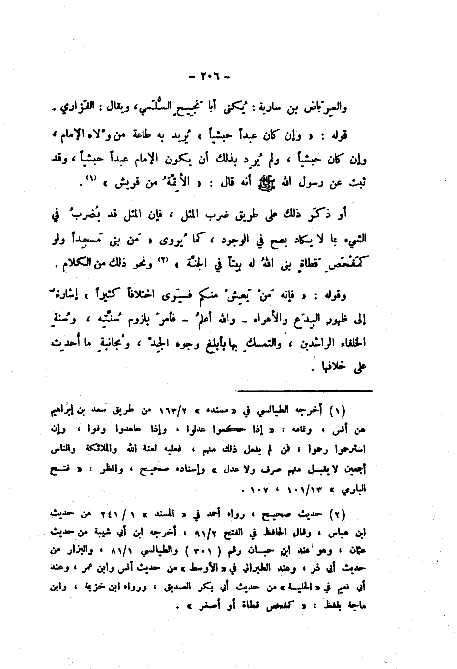 قَوْلُهُ: «وَإِنْ كَانَ عَبْدًا حَبَشِيًّا» يُرِيدُ بِهِ طَاعَةَ مَنْ وَلاهُ الإِمَامُ، وَإِنْ كَانَ حَبَشِيًّا، وَلَمْ يُرِدْ بِذَلِكَ أَنْ يَكُونَ الإِمَامُ عَبْدًا حَبَشِيًّا، وَقَدْ ثَبَتَ عَنْ رَسُولِ اللَّهِ صَلَّى اللهُ عَلَيْهِ وَسَلَّمَ، أَنَّهُ قَالَ: «الأَئِمَّةُ مِنْ قُرَيْشٍ».