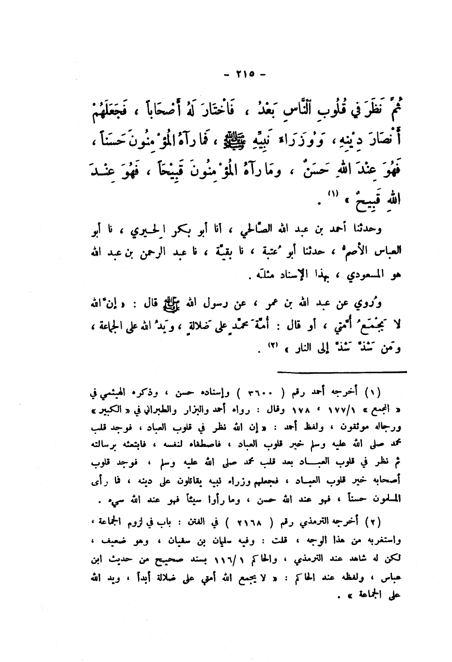 ثُمَّ نَظَرَ فِي قُلُوبِ النَّاسِ بَعْدُ، فَاخْتَارَ لَهُ أَصْحَابًا، فَجَعَلَهُمْ أَنْصَارَ دِينِهِ، وَوُزَرَاءَ نَبِيِّهِ صَلَّى اللهُ عَلَيْهِ وَسَلَّمَ، فَمَا رَآهُ الْمُؤْمِنُونَ حَسَنًا، فَهُوَ عِنْدَ اللَّهِ حَسَنٌ، وَمَا رَآهُ الْمُؤْمِنُونَ قَبِيحًا، فَهُوَ عِنْدَ اللَّهِ قَبِيحٌ».