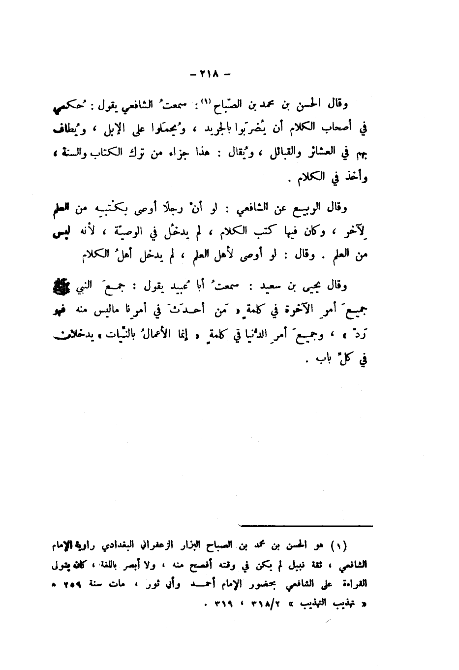 وَقَالَ الْحَسَنُ بْنُ مُحَمَّدٍ الصَّبَّاحُ: سَمِعْتُ الشَّافِعِيَّ، يَقُولُ: حُكْمِي فِي أَصْحَابِ الْكَلامِ أَنْ يُضْرَبُوا بِالْجَرِيدِ، وَيُحْمَلُوا عَلَى الإِبِلِ، وَيُطَافُ بِهِمْ فِي الْعَشَائِرِ وَالْقَبَائِلِ، وَيُقَالُ: هَذَا جَزَاءُ مَنْ تَرَكَ الْكِتَابَ وَالسُّنَّةَ، وَأَخَذَ فِي الْكَلامِ.
